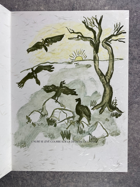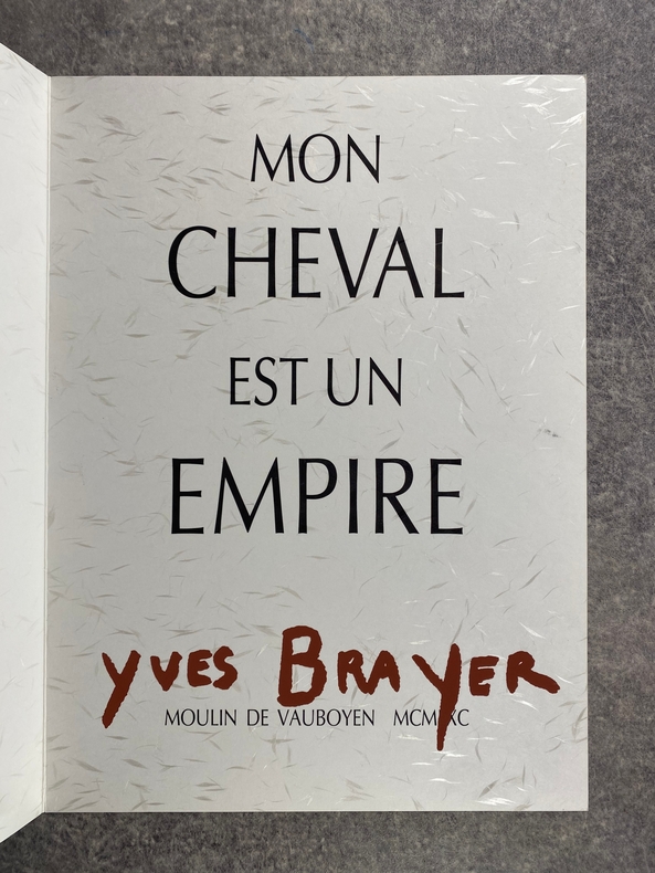 BIEVRES-EN-ESSONNE. PIERRE ET PHILIPPE DE TARTAS. 1990. GRAND IN-4 EN FEUILLES (30 X 40,5 CENTIMETRES ENVIRON) DE 59 + 9 PAGES, COUVERTURE ILLUSTREE EN COULEURS, SOUS EMBOITAGE PERCALINE NOIRE AVEC FENETRE SUR LE PLAT SUPERIEUR ORNEE D'UN CHEVAL DORE ESTAMPE EN RELIEF SUR FOND ROUGE. ILLUSTRE DE TRES NOMBREUSES LITHOGRAPHIES EN COULEURS, DONT 2 HORS TEXTE ET D'UNE SUITE DE 8 AQUARELLES HORS TEXTE GRAVEES SUR BOIS EN COULEURS, DONT UNE PLANCHE DOUBLE. LES POEMES DE GENEVIEVE LAPORTE SONT COMPLETES PAR UN TEXTE DE 9 PAGES CONSACRE A L'AUTEUR ET A L'ARTISTE PAR ARMAND LANOUX. PREMIER TIRAGE LIMITE A 230 EXEMPLAIRES NUMEROTES, TOUS SUR JAPON NACRE, CELUI-CI PORTANT LE NUMERO 217, SIGNE PAR L'EDITEUR, SIGNE ET VISE PAR MINISTERE D'HUISSIER. PETITES TRACES DE FROTTEMENTS EXTERIEURS, INFIME DEFAUT SUR LE MORS SUPERIEUR DE LA CHEMISE, SINON BEL EXEMPLAIRE. PRIX ETABLI EN FONCTION DES PETITS DEFAUTS SIGNALES
