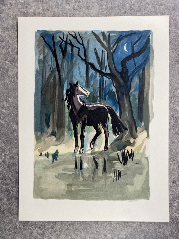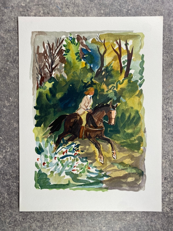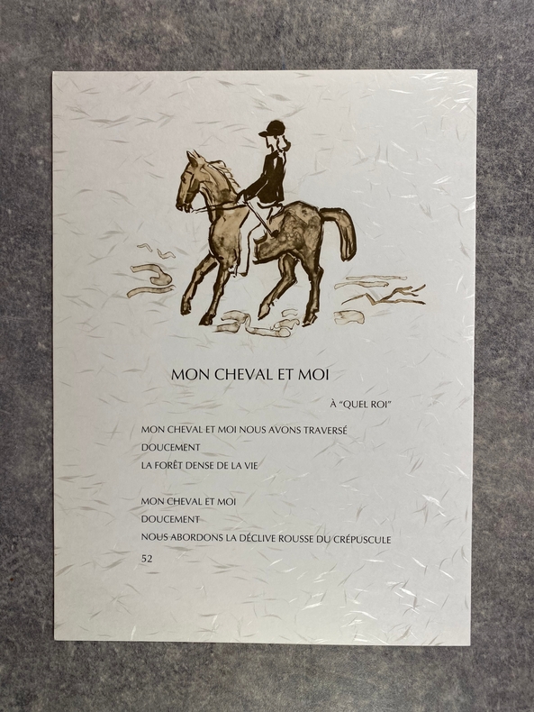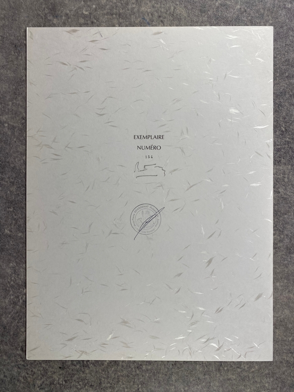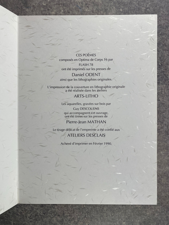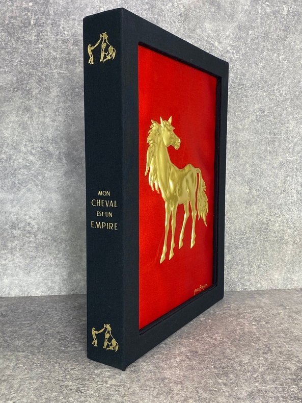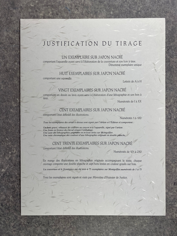 BIEVRES-EN-ESSONNE. PIERRE ET PHILIPPE DE TARTAS. 1990. GRAND IN-4 EN FEUILLES (30 X 40,5 X 6 CENTIMETRES ENVIRON) DE 59 + 7 PAGES, COUVERTURE ILLUSTREE EN COULEURS, SOUS EMBOITAGE PERCALINE NOIRE AVEC FENETRE SUR LE PLAT SUPERIEUR ORNEE D'UN CHEVAL DORE ESTAMPE EN RELIEF SUR FOND ROUGE. ILLUSTRE DE TRES NOMBREUSES LITHOGRAPHIES EN COULEURS, DONT 2 HORS TEXTE ET D'UNE SUITE DE 9 AQUARELLES HORS TEXTE GRAVEES SUR BOIS EN COULEURS, DONT UNE PLANCHE DOUBLE, SUR BFK RIVES (8 + 1, AU LIEU DES 7 + 1 ANNONCEES, SOIT AVEC UNE PLANCHE SUPPLEMENTAIRE). LES POEMES DE GENEVIEVE LAPORTE SONT COMPLETES PAR UN TEXTE DE 7 PAGES CONSACRE A L'AUTEUR ET A L'ARTISTE PAR ARMAND LANOUX, SUR MONTGOLFIER. PREMIER TIRAGE LIMITE A 230 EXEMPLAIRES NUMEROTES, TOUS SUR JAPON NACRE, CELUI-CI SIGNE PAR L'EDITEUR ET L'ARTISTE, SIGNE ET VISE PAR MINISTERE D'HUISSIER. BIEN QUE PORTANT LE NUMERO IX, IL EST BIEN CONFORME AU DESCRIPTIF DES 130 EXEMPLAIRES COMPORTANT L'ETAT DEFINITIF DES ILLUSTRATIONS. LEGER PLI EN MARGE DE LA COUVERTURE, SINON BEL EXEMPLAIRE.