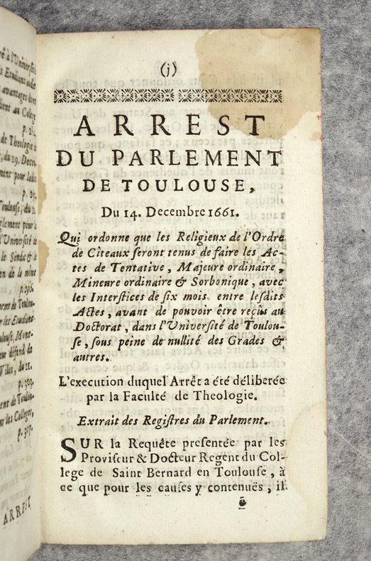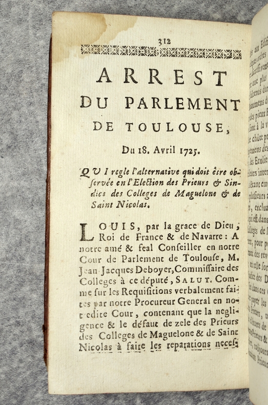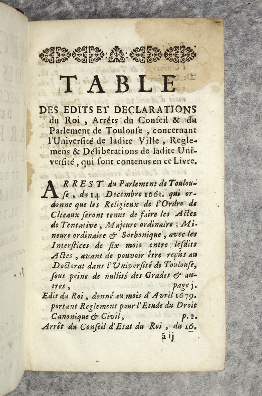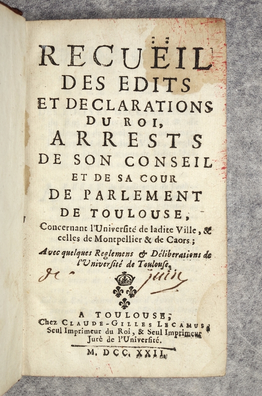 A TOULOUSE. CHEZ CLAUDE-GILLES LECAMUS, SEUL IMPRIMEUR DU ROI, & SEUL IMPRIMEUR JURE DE L’UNIVERSITE. 1722. IN-12 (9,5 X 15 X 3 CENTIMETRES ENVIRON) DE (8) + IV ET 326 PAGES, RELIURE D'EPOQUE PLEIN VEAU MARBRE, DOS A CINQ NERFS ORNE DE CAISSONS A FLEURONS DORES, TITRE DORE SUR ETIQUETTE MAROQUIN HAVANE, TRANCHES MOUCHETEES ROUGES. QUELQUES PETITS DEFAUTS EXTERIEURS, DONT PETITS MANQUES DE CUIR, SINON BON EXEMPLAIRE.
