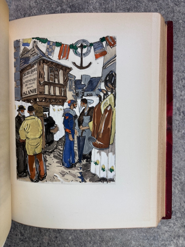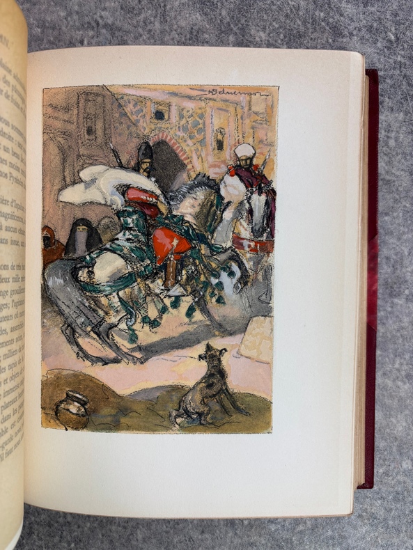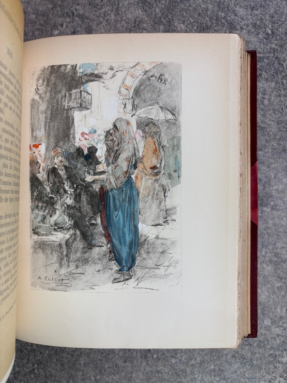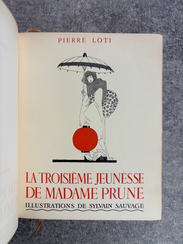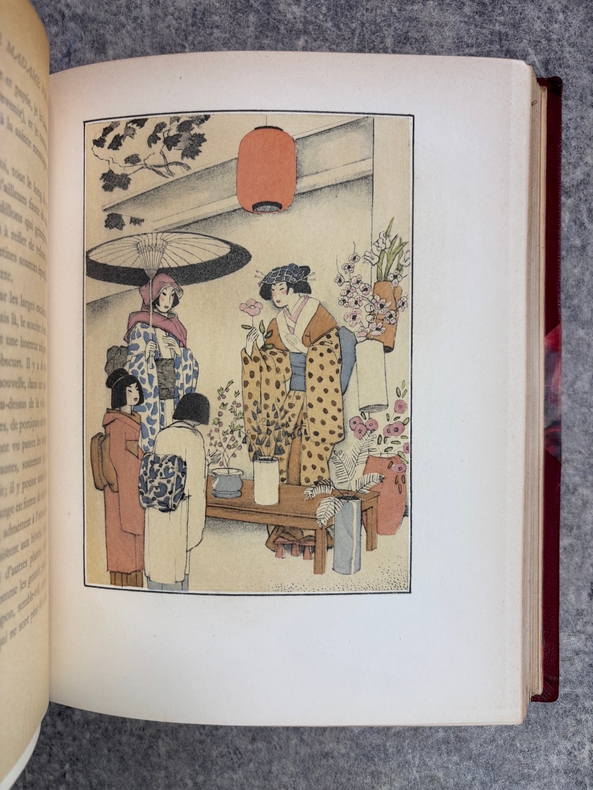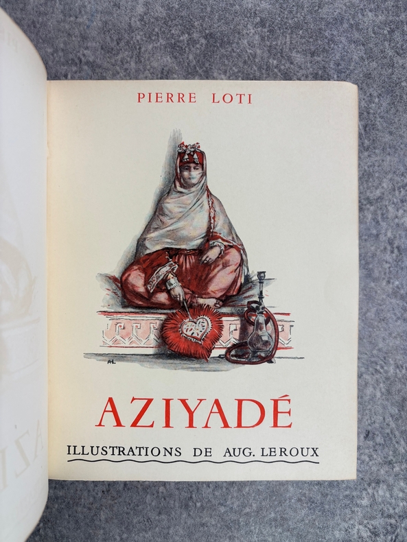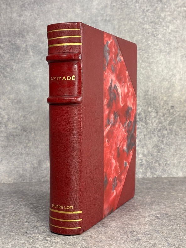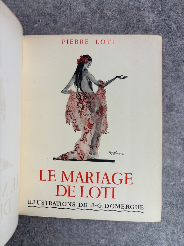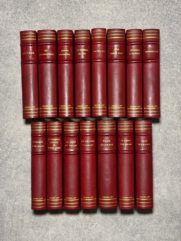 PARIS. CALMANN LEVY, EDITEURS. 1936-1937. 15 VOLUMES PETIT IN-4 (19 X 22,5 CENTIMETRES ENVIRON), RELIURE DE L’EDITEUR 1/2 CHAGRIN ROUGE A COINS, DOS A DEUX FORTS NERFS ORNE DE FILETS DORES, PLAT SUPERIEUR ORNE DE FILETS DORES, TITRE ET TETE DORES, COUVERTURE ILLUSTREE EN COULEURS ET DOS CONSERVES. CONTIENT : - AZIYADE. ILLUSTRATIONS D'AUGUSTE LEROUX, - LES DESENCHANTEES. ILLUSTRATIONS DE A. CALBET, - MADAME CHRYSANTHEME. ILLUSTRATIONS DE SYLVAIN SAUVAGE, - LE MARIAGE DE LOTI. ILLUSTRATIONS DE JEAN-GABRIEL DOMERGUE, - MATELOT. ILLUSTRATIONS DE CHARLES FOUQUERAY, - MON FRERE YVES. ILLUSTRATIONS D'EMILIEN DUFOUR, - PECHEUR D'ISLANDE. ILLUSTRATIONS DE MATHURIN MEHEUT, - RAMUNTCHO. ILLUSTRATIONS DE PIERRE BRISSAUD, - LE ROMAN D'UN SPAHI. ILLUSTRATIONS DE CHARLES FOUQUERAY, - LA TROISIEME JEUNESSE DE MADAME PRUNE. ILLUSTRATIONS DE SYLVAIN SAUVAGE, - LA MORT DE PHILAE. ILLUSTRATIONS DE HENRI DELUERMOZ, - UN PELERIN D'ANGKOR, SUIVI DE LE LIVRE DE LA PITIE ET DE LA MORT. ILLUSTRATIONS DE MAURICE LALAU, - PRIME JEUNESSE, SUIVI DE UN JEUNE OFFICIER PAUVRE. ILLUSTRATIONS DE A. E. MARTY, - LE ROMAN D'UN ENFANT. ILLUSTRATIONS DE A. E. MARTY, - VERS HISPAHAN. ILLUSTRATIONS DE HENRI DELUERMOZ. EDITION ILLUSTREE D'UN PORTRAIT DE LOTI GRAVE AU BURIN PAR GANDON ET DE 400 ILLUSTRATIONS MISES EN COULEURS AU POCHOIR PAR BEAUFUME ET JACOMET, CERTAINES EN DEUX TONS. PREMIER TIRAGE, LIMITE A 1120 EXEMPLAIRES NUMEROTES. UN DES 1000 SUR VELIN PUR FIL LAFUMA AVEC LE PORTRAIT EN DOUBLE ETAT ET UNE SUITE EN NOIR DES HORS TEXTE EN COULEURS, CELUI-CI PORTANT LE NUMERO 917. «EDITION RECHERCHEE ET COTEE». (CARTERET. IV. 247-248). PETITES TRACES DE FROTTEMENTS, SINON BEL EXEMPLAIRE.
