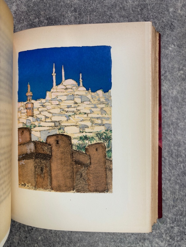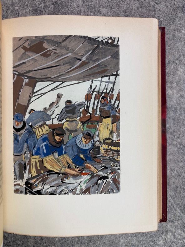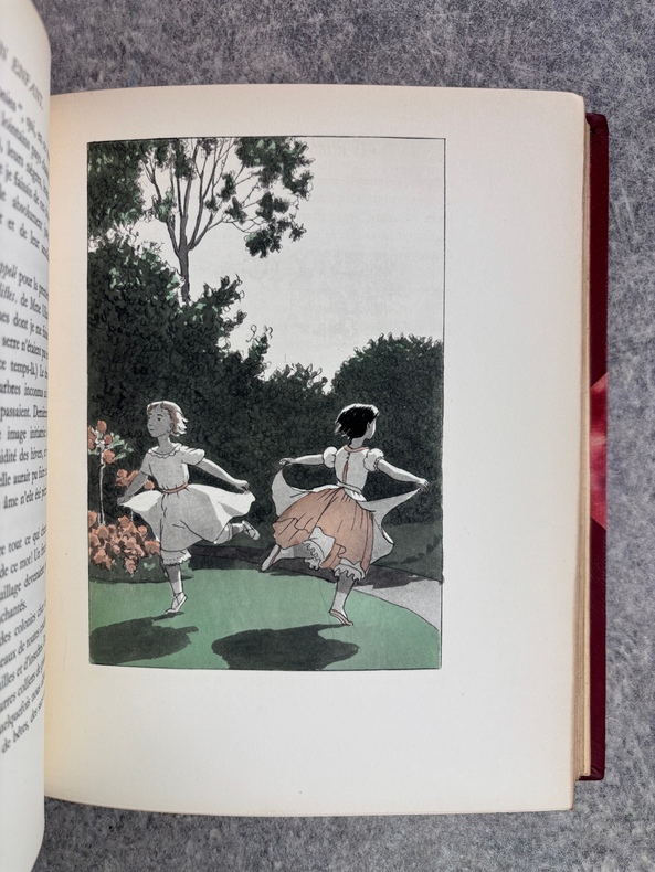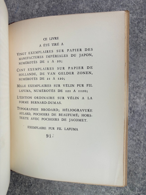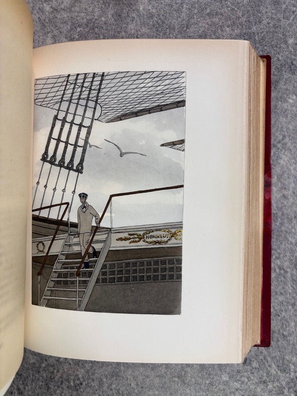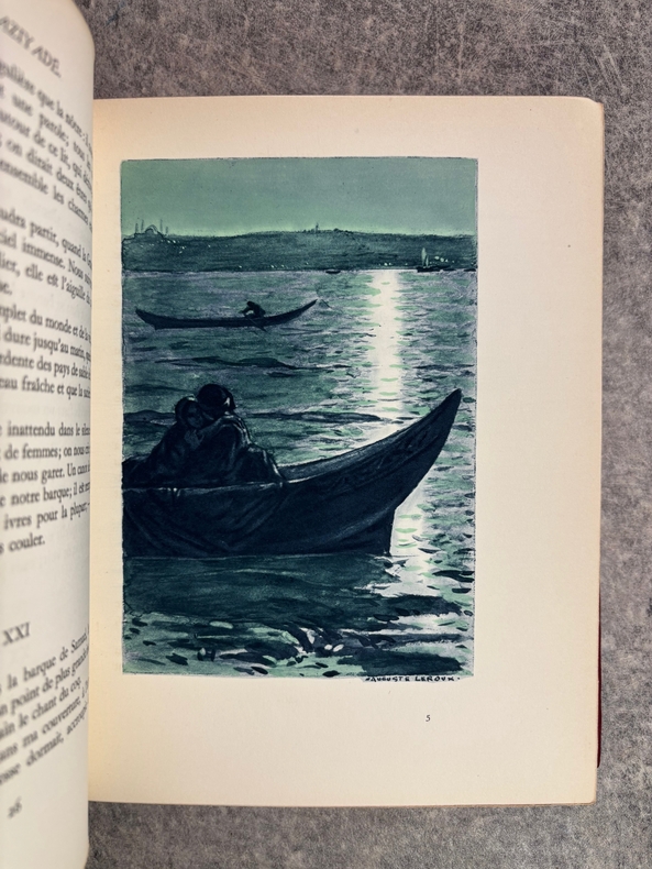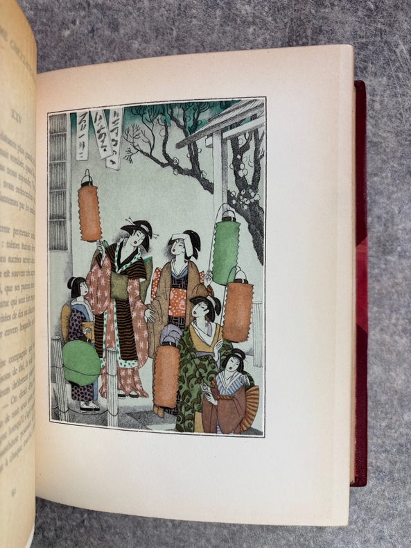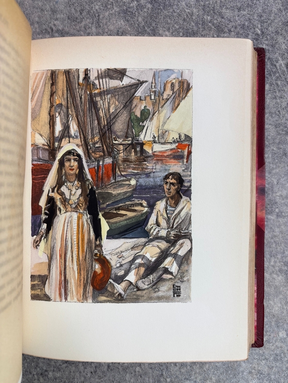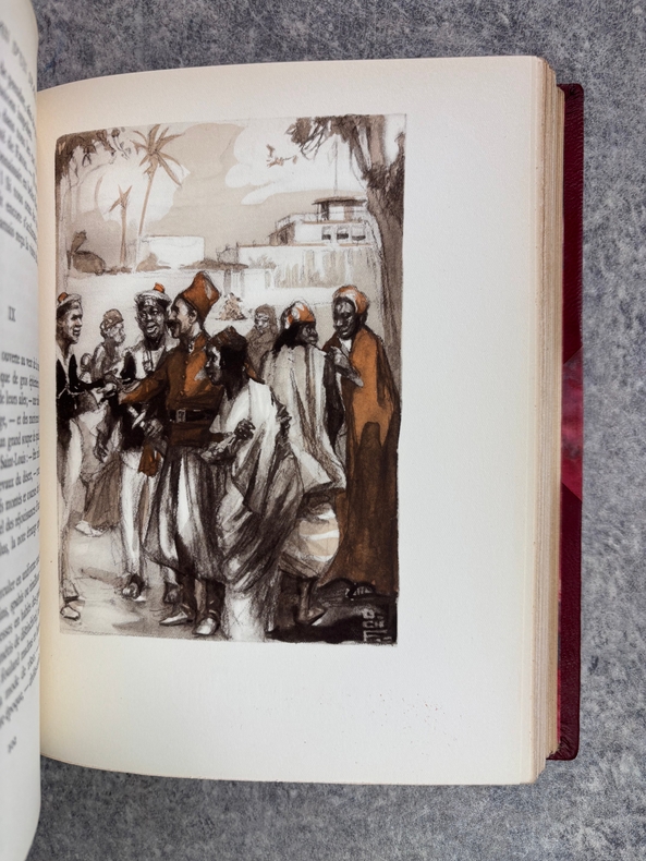 PARIS. CALMANN LEVY, EDITEURS. 1936-1937. 15 VOLUMES PETIT IN-4 (19 X 22,5 CENTIMETRES ENVIRON), RELIURE DE L’EDITEUR 1/2 CHAGRIN ROUGE A COINS, DOS A DEUX FORTS NERFS ORNE DE FILETS DORES, PLAT SUPERIEUR ORNE DE FILETS DORES, TITRE ET TETE DORES, COUVERTURE ILLUSTREE EN COULEURS ET DOS CONSERVES. CONTIENT : - AZIYADE. ILLUSTRATIONS D'AUGUSTE LEROUX, - LES DESENCHANTEES. ILLUSTRATIONS DE A. CALBET, - MADAME CHRYSANTHEME. ILLUSTRATIONS DE SYLVAIN SAUVAGE, - LE MARIAGE DE LOTI. ILLUSTRATIONS DE JEAN-GABRIEL DOMERGUE, - MATELOT. ILLUSTRATIONS DE CHARLES FOUQUERAY, - MON FRERE YVES. ILLUSTRATIONS D'EMILIEN DUFOUR, - PECHEUR D'ISLANDE. ILLUSTRATIONS DE MATHURIN MEHEUT, - RAMUNTCHO. ILLUSTRATIONS DE PIERRE BRISSAUD, - LE ROMAN D'UN SPAHI. ILLUSTRATIONS DE CHARLES FOUQUERAY, - LA TROISIEME JEUNESSE DE MADAME PRUNE. ILLUSTRATIONS DE SYLVAIN SAUVAGE, - LA MORT DE PHILAE. ILLUSTRATIONS DE HENRI DELUERMOZ, - UN PELERIN D'ANGKOR, SUIVI DE LE LIVRE DE LA PITIE ET DE LA MORT. ILLUSTRATIONS DE MAURICE LALAU, - PRIME JEUNESSE, SUIVI DE UN JEUNE OFFICIER PAUVRE. ILLUSTRATIONS DE A. E. MARTY, - LE ROMAN D'UN ENFANT. ILLUSTRATIONS DE A. E. MARTY, - VERS HISPAHAN. ILLUSTRATIONS DE HENRI DELUERMOZ. EDITION ILLUSTREE D'UN PORTRAIT DE LOTI GRAVE AU BURIN PAR GANDON ET DE 400 ILLUSTRATIONS MISES EN COULEURS AU POCHOIR PAR BEAUFUME ET JACOMET, CERTAINES EN DEUX TONS. PREMIER TIRAGE, LIMITE A 1120 EXEMPLAIRES NUMEROTES. UN DES 1000 SUR VELIN PUR FIL LAFUMA AVEC LE PORTRAIT EN DOUBLE ETAT ET UNE SUITE EN NOIR DES HORS TEXTE EN COULEURS, CELUI-CI PORTANT LE NUMERO 917. «EDITION RECHERCHEE ET COTEE». (CARTERET. IV. 247-248). PETITES TRACES DE FROTTEMENTS, SINON BEL EXEMPLAIRE.