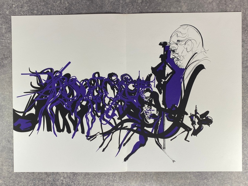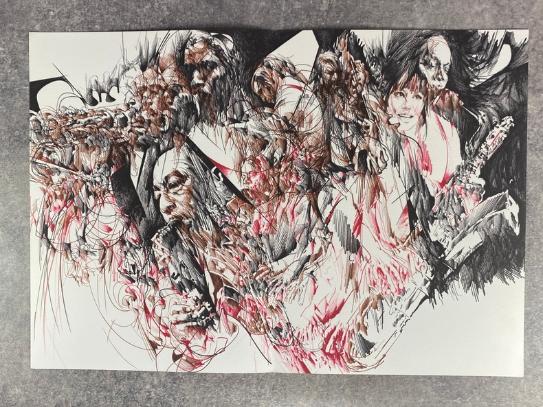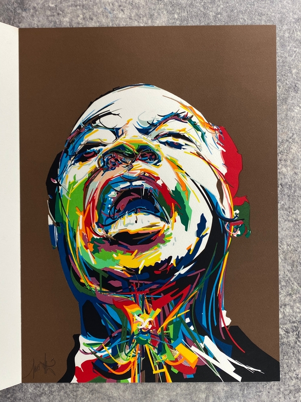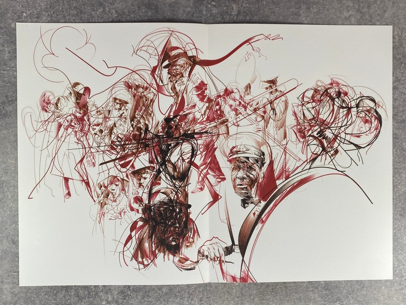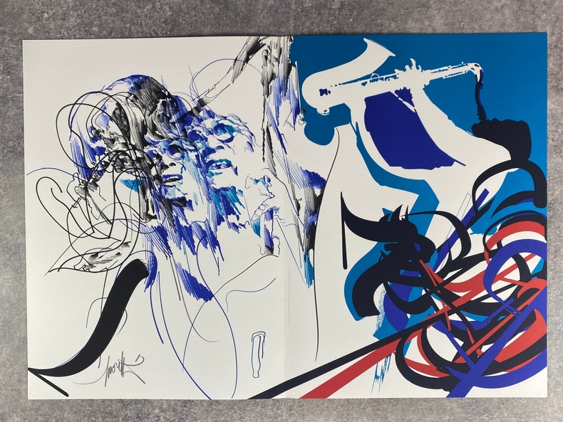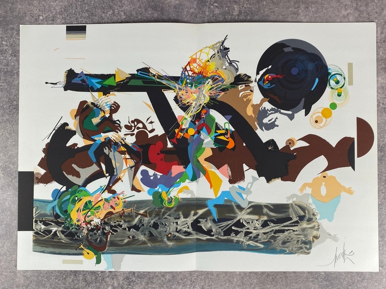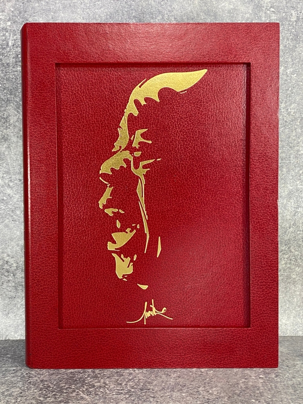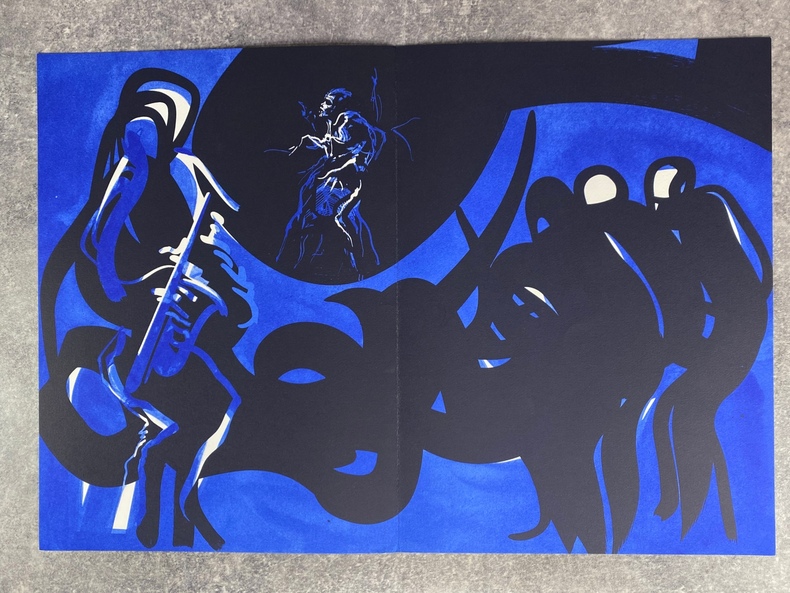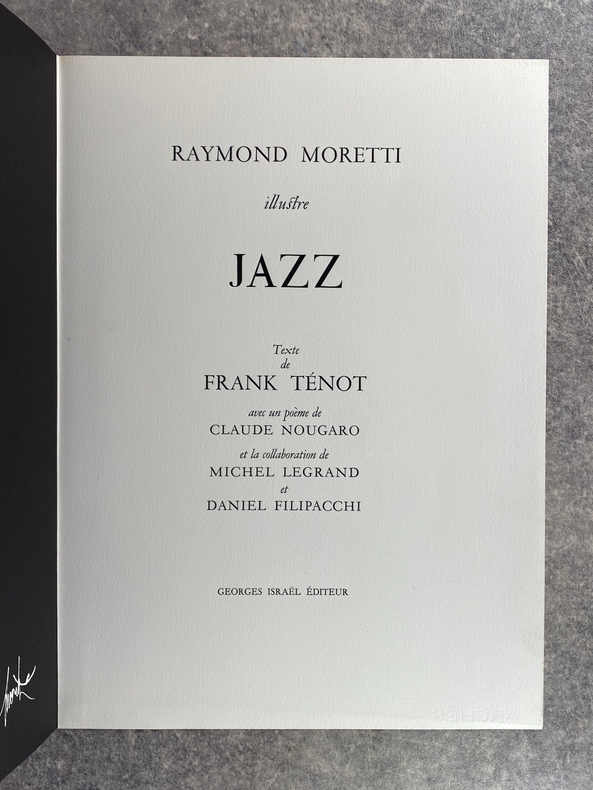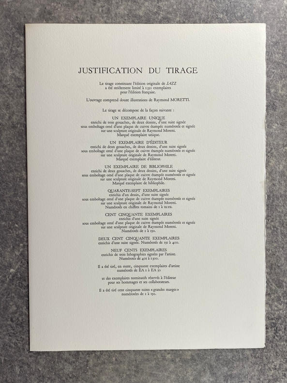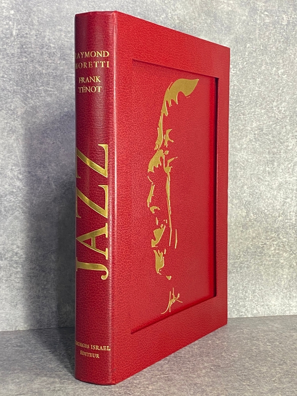 PARIS. GEORGES ISRAEL EDITEUR. 1983. IN-FOLIO (35,5 X 47,5 X 6 CENTIMETRES ENVIRON) DE 56 + (7) PAGES, SOUS COUVERTURE CARTONNEE BLANCHE ILLUSTREE EN DORE ET EMBOITAGE CARTONNE ROUGE DE L'EDITEUR, PLAT SUPERIEUR ILLUSTRE EN DORE, TITRE DORE SUR DOS LISSE. ILLUSTRE DE 13 LITHOGRAPHIES HORS TEXTE : UNE EN NOIR EN FRONTISPICE ET 12 EN COULEURS, DONT 11 A DOUBLE PAGE. AVEC 3 LITHOGRAPHIES SIGNEES AU CRAYON PAR RAYMOND MORETTI, 2 DOUBLES ET UNE SIMPLE (PAGES 12-13, 16-17 ET 35). PREMIER TIRAGE LIMITE A 1350 EXEMPLAIRES NUMEROTES, TOUS SUR VELIN PUR CHIFFON DES PAPETERIES D'ARCHES, CELUI-CI H. C., JUSTIFIE A LA MAIN ET SIGNE PAR L'EDITEUR. ENRICHI D’UN TRES BEL ENVOI CALLIGRAPHIE PAR L’ARTISTE, ADRESSE A FRANK TENOT ET TENANT TOUTE LA DOUBLE PAGE BLANCHE EN TETE DE L’OUVRAGE, EN NOIR ET EN DORE : « MERCI FRANK DE TON TRAVAIL ET DE TON AMITIE. MORETTI 85 ». ON JOINT UNE PLAQUE EN CUIVRE AVEC LE PROFIL DE LOUIS AMSTRONG PAR MORETTI (27,5 X 37 CENTIMETRES ENVIRON). PETIT DEFAUT A L’EMBOITAGE, SINON BEL ENSEMBLE.