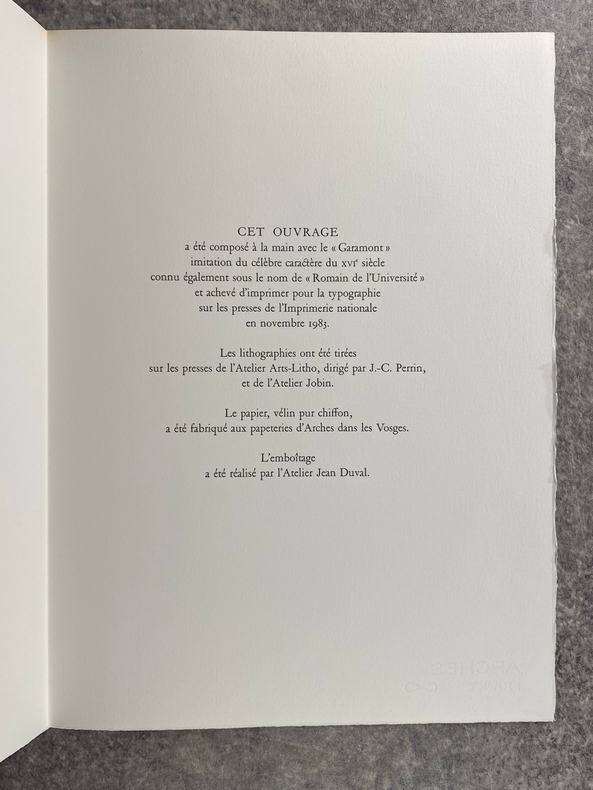 PARIS. GEORGES ISRAEL EDITEUR. 1983. IN-FOLIO (35,5 X 47,5 X 6 CENTIMETRES ENVIRON) DE 56 + (7) PAGES, SOUS COUVERTURE CARTONNEE BLANCHE ILLUSTREE EN DORE ET EMBOITAGE CARTONNE ROUGE DE L'EDITEUR, PLAT SUPERIEUR ILLUSTRE EN DORE, TITRE DORE SUR DOS LISSE. ILLUSTRE DE 13 LITHOGRAPHIES HORS TEXTE : UNE EN NOIR EN FRONTISPICE ET 12 EN COULEURS, DONT 11 A DOUBLE PAGE. PREMIER TIRAGE LIMITE A 1350 EXEMPLAIRES NUMEROTES, TOUS SUR VELIN PUR CHIFFON DES PAPETERIES D'ARCHES, CELUI-CI NON JUSTIFIE. BON EXEMPLAIRE.