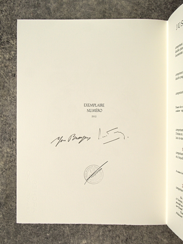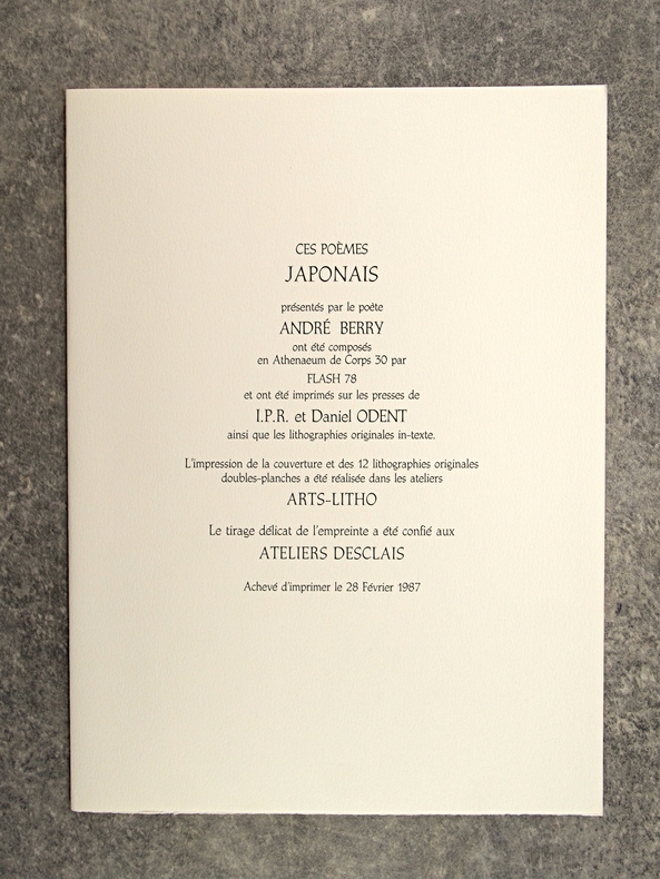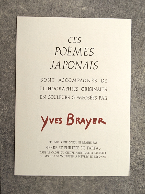 Pierre Et Philippe De Tartas Paris 1987 Grand in-4 ( 400 X 290 mm ) en feuilles sous coffret de toile noire et rouge orné au premier plat d'un portique japonais et du nom de l'auteur en lettres d'or, et chemise illustrée en couleurs. EDITION ORIGINALE et premier tirage des 54 lithographies originales de Yves BRAYER dont 12 en couleurs à double-page sous serpentes. Tirage limité à 500 exemplaires, celui-ci 1 des 250 sur grand vélin d'Arches comportant l'état définitif des illustrations. Très bel exemplaire.