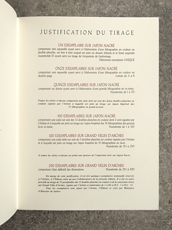 BIEVRES-EN-ESSONNE. PIERRE ET PHILIPPE DE TARTAS. 1987. GRAND IN-4 EN FEUILLES (30 X 40,5 X 5,5 CENTIMETRES ENVIRON) NON PAGINE, COUVERTURE ILLUSTREE EN COULEURS, SOUS EMBOITAGE PERCALINE NOIRE AVEC FENETRE SUR LE PLAT SUPERIEUR ORNEE D'UN PORTIQUE JAPONAIS DORE ESTAMPE EN RELIEF SUR FOND ROUGE. ILLUSTRE DE TRES NOMBREUSES LITHOGRAPHIES EN COULEURS, DONT LA COUVERTURE ET 12 PLANCHES DOUBLES HORS TEXTE. PREMIER TIRAGE LIMITE A 527 EXEMPLAIRES NUMEROTES. UN DES 350 SUR VELIN D’ARCHES, CELUI-CI PORTANT LE NUMERO 440 ET COMPORTANT L'ETAT DEFINITIF DES ILLUSTRATIONS, SIGNE PAR L'EDITEUR ET L'ARTISTE ET VISE PAR MINISTERE D'HUISSIER. PETITS DEFAUTS SANS GRAVITE SUR L’ETUI, SINON BEL EXEMPLAIRE.