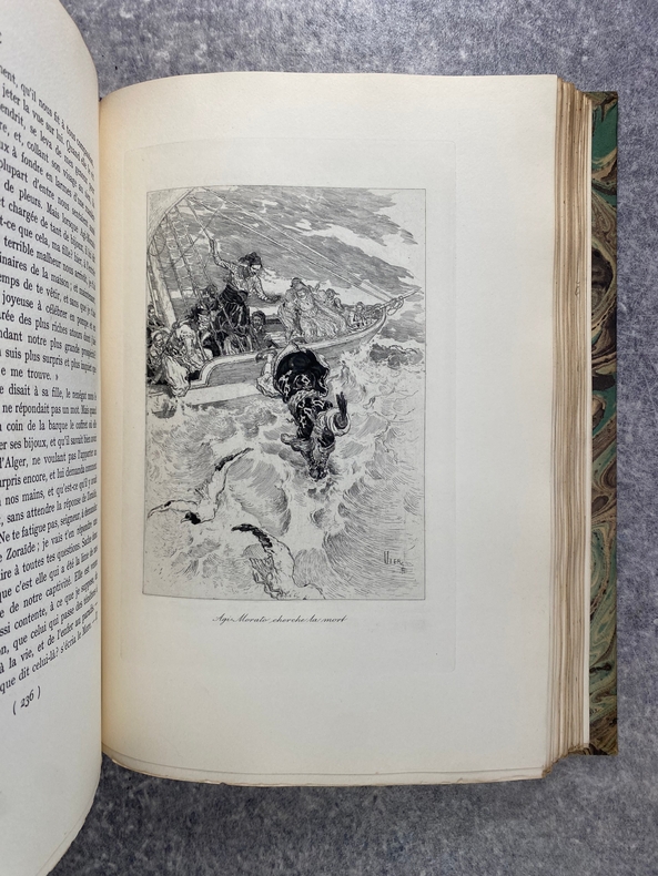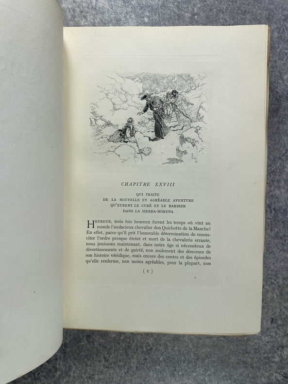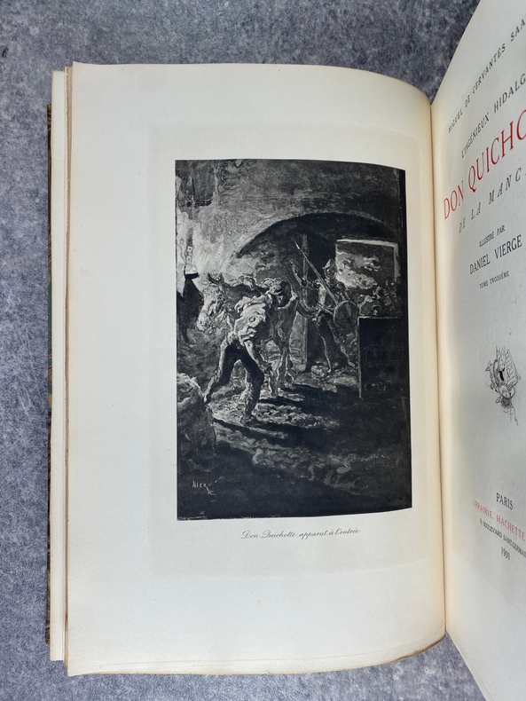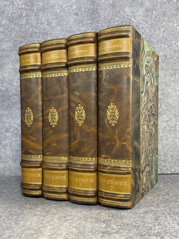 PARIS. HACHETTE. 1909. 4 FORTS VOLUMES IN-4 (22 X 30 X 25 CENTIMETRES ENVIRON) DE (4) + 375, (4) + 399, (4) + 417 ET (4) + 425 PAGES, RELIURE D’EPOQUE PLEIN MAROQUIN VERT, DOS A CINQ FORTS NERFS, TITRE ET TRANCHES DORES, CONTRE PLATS ENCADRES D’UNE LARGE BANDE DE MAROQUIN VERT ORNEE DE 8 FILETS DORES, GARDES ET CONTRE GARDES EN PAPIER MARBRES, DOUBLE FILET SUR COUPES, COUVERTURE ET DOS CONSERVES, SOUS ETUI BORDE (H. BLANCHETIERE RELIEUR). ILLUSTRE DE 260 COMPOSITIONS TIREES EN TAILLE-DOUCE DONT 101 PLANCHES HORS TEXTE. TIRAGE LIMITE A 350 EXEMPLAIRES NUMEROTES. UN DES 340 SUR PAPIER VELIN, CELUI-CI PORTANT LE NUMERO 76. «EDITION COTEE» (CARTERET. IV. 94). «MAGNIFICA EDICION» (MENAGES Y FONBUENA. 726). PETIT DEFAUT SUR UN ETUI, PETITES TRACES D’USURE ET TACHES SUR LES DOS INSOLES, SINON BEL EXEMPLAIRE DE CET OUVRAGE RARE ET RECHERCHE POUR LES SUPERBES ILLUSTRATIONS DE DANIEL VIERGE.
