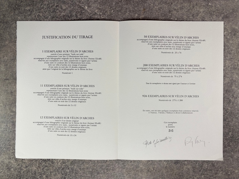 SEYSSINET-PARISET. ED. DU GRESIVAUDAN. SANS DATE (1992). IN-4 (26,5 X 34 X 5,5 CENTIMETRES ENVIRON) EN FEUILLES DE 196 PAGES, SOUS COUVERTURE ET EMBOITAGE PERCALINE BLEUE A FENETRE LAISSANT APPARAITRE LA COUVERTURE ILLUSTREE EN COULEURS. ILLUSTRE DE 12 PLANCHES EN COULEURS HORS-TEXTE ET DE NOMBREUX DESSINS EN NOIR. EDITION ORIGINALE ET PREMIER TIRAGE, LIMITE A 1200 EXEMPLAIRES NUMEROTES, TOUS SUR VELIN D'ARCHES. UN DES 200 ACCOMPAGNE D’UNE LITHOGRAPHIE ORIGINALE SUR LE THEME DU LIVRE (FORMAT 32 X 48), AINSI QUE D’UNE SUITE EN COULEURS DES 12 ILLUSTRATIONS HORS TEXTE ET D’UNE SUITE EN NOIR DES 12 DESSINS ORIGINAUX, CELUI-CI PORTANT LE NUMERO 205, SIGNE PAR L'AUTEUR ET PAR L'ARTISTE. BEL EXEMPLAIRE.