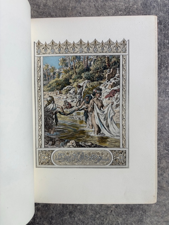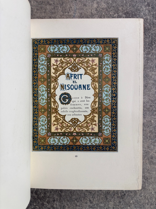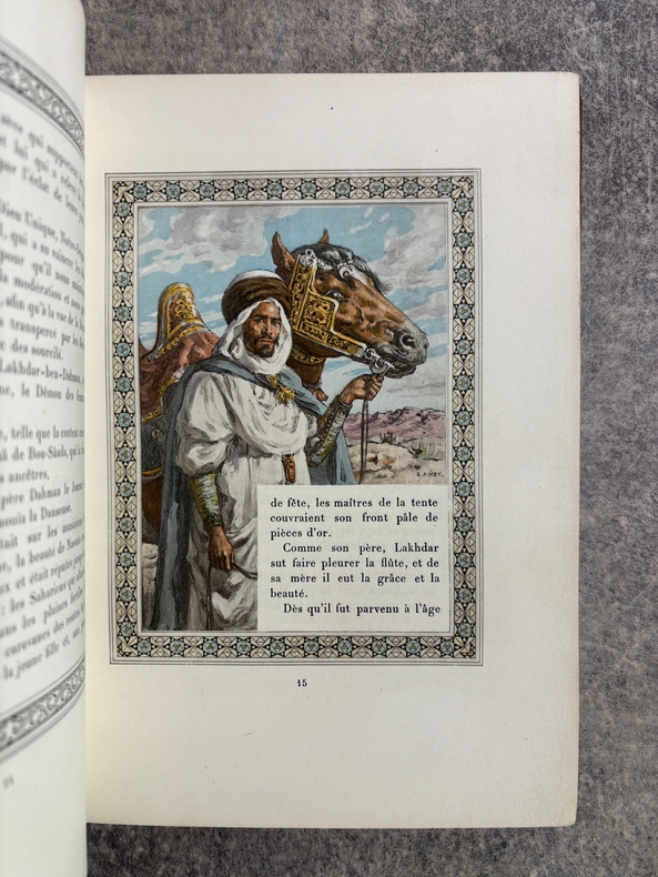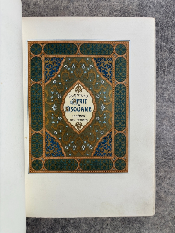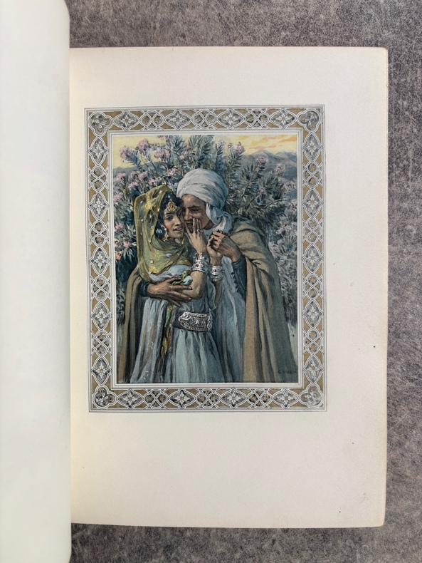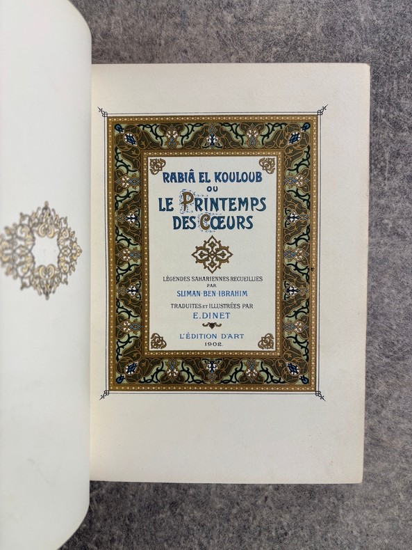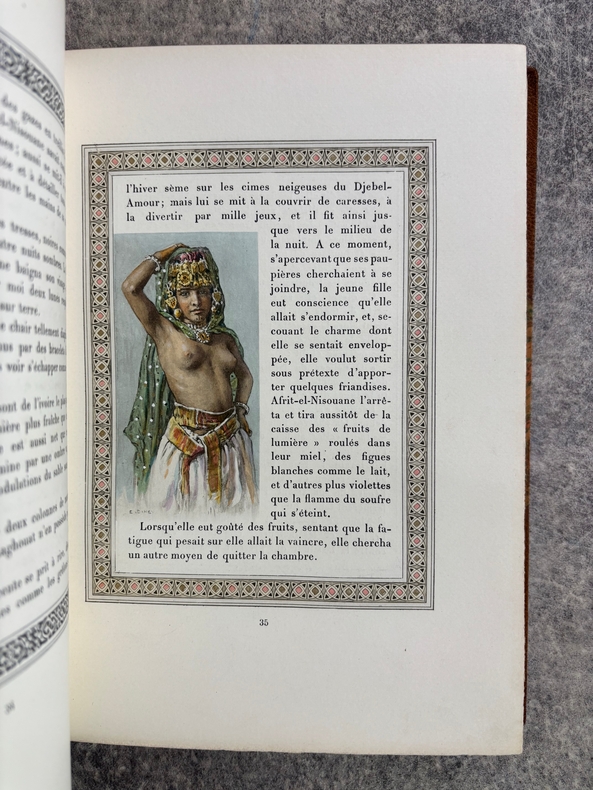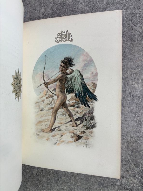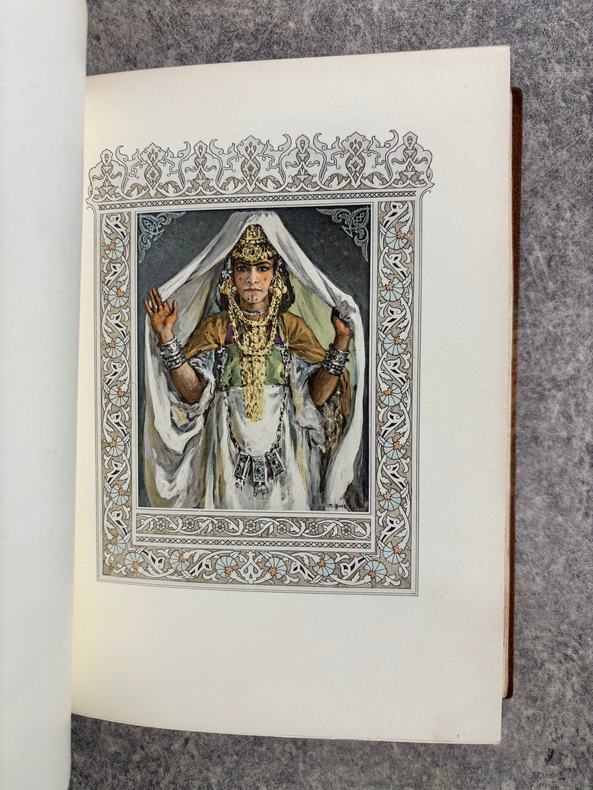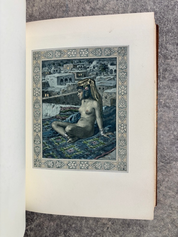 PARIS. L’EDITION D’ART. H. PIAZZA, EDITEUR. 1902. IN-8 (17,5 X 23,5 X 3 CENTIMETRES ENVIRON) DE 175 ET (5) PAGES, RELIURE D’EPOQUE 1/2 MAROQUIN HAVANE A COINS, DOS LISSE ORNE D’UN DECOR MOSAIQUE, TITRE DORE SUR ETIQUETTE MAROQUIN VERT, TETE DOREE, COUVERTURE ILLUSTREE EN COULEURS CONSERVEE (KAUFFMANN-HORCLOIS RELIEUR). ILLUSTRE DE 52 COMPOSITIONS EN OR ET EN COULEURS, DONT 6 A PLEINE PAGE. CHAQUE PAGE DE TEXTE ENCADREE D’UN DECOR GEOMETRIQUE EN NOIR OU EN COULEURS. PREMIER TIRAGE LIMITE A 300 EXEMPLAIRES NUMEROTES. UN DES 260 SUR PAPIER VELIN A LA CUVE, CELUI-CI HORS COMMERCE, IMPRIME POUR M. E. GRENINGAIRE. “LE PLUS RARE DES OUVRAGES DE DINET” (CARTERET. IV. 141). EX-LIBRIS GRAVE “E. BRUELL”. TRES BEL EXEMPLAIRE.