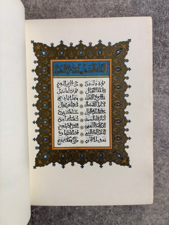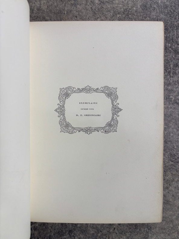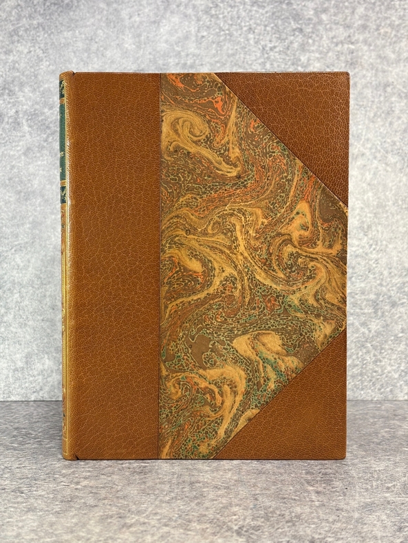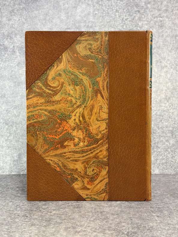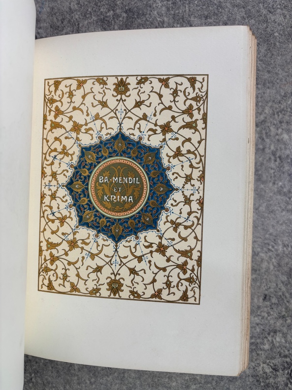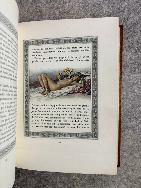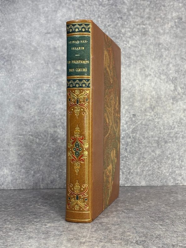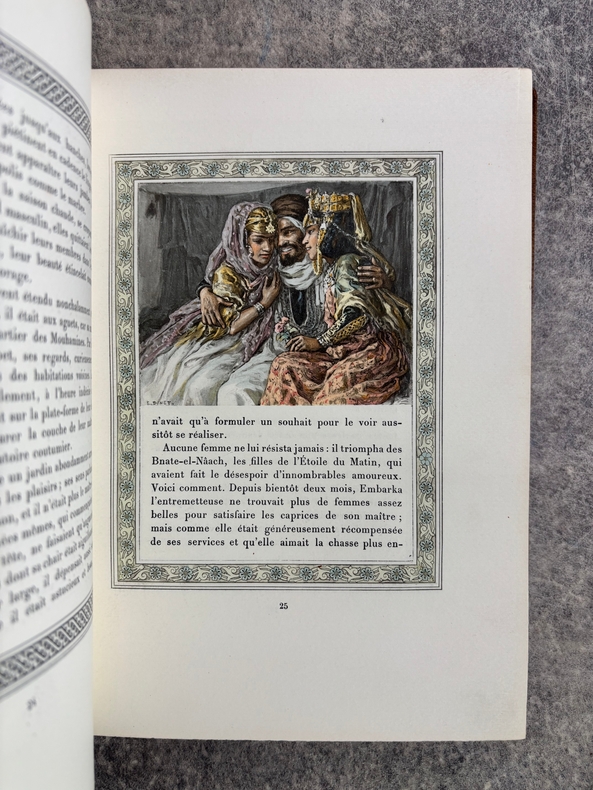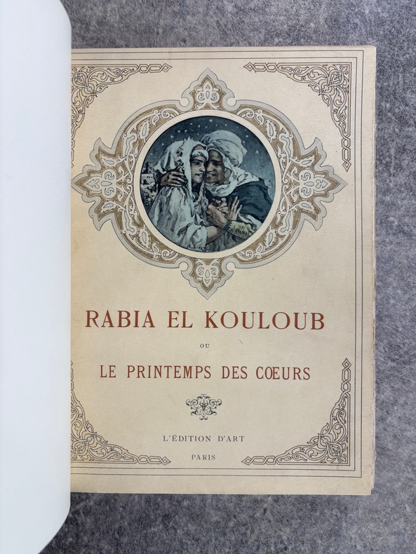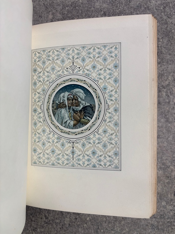 PARIS. L’EDITION D’ART. H. PIAZZA, EDITEUR. 1902. IN-8 (17,5 X 23,5 X 3 CENTIMETRES ENVIRON) DE 175 ET (5) PAGES, RELIURE D’EPOQUE 1/2 MAROQUIN HAVANE A COINS, DOS LISSE ORNE D’UN DECOR MOSAIQUE, TITRE DORE SUR ETIQUETTE MAROQUIN VERT, TETE DOREE, COUVERTURE ILLUSTREE EN COULEURS CONSERVEE (KAUFFMANN-HORCLOIS RELIEUR). ILLUSTRE DE 52 COMPOSITIONS EN OR ET EN COULEURS, DONT 6 A PLEINE PAGE. CHAQUE PAGE DE TEXTE ENCADREE D’UN DECOR GEOMETRIQUE EN NOIR OU EN COULEURS. PREMIER TIRAGE LIMITE A 300 EXEMPLAIRES NUMEROTES. UN DES 260 SUR PAPIER VELIN A LA CUVE, CELUI-CI HORS COMMERCE, IMPRIME POUR M. E. GRENINGAIRE. “LE PLUS RARE DES OUVRAGES DE DINET” (CARTERET. IV. 141). EX-LIBRIS GRAVE “E. BRUELL”. TRES BEL EXEMPLAIRE.