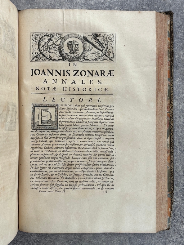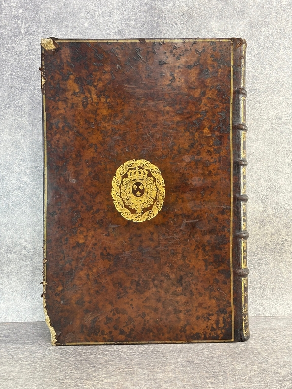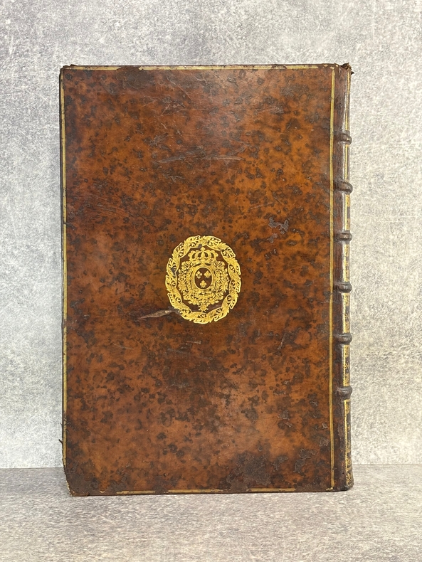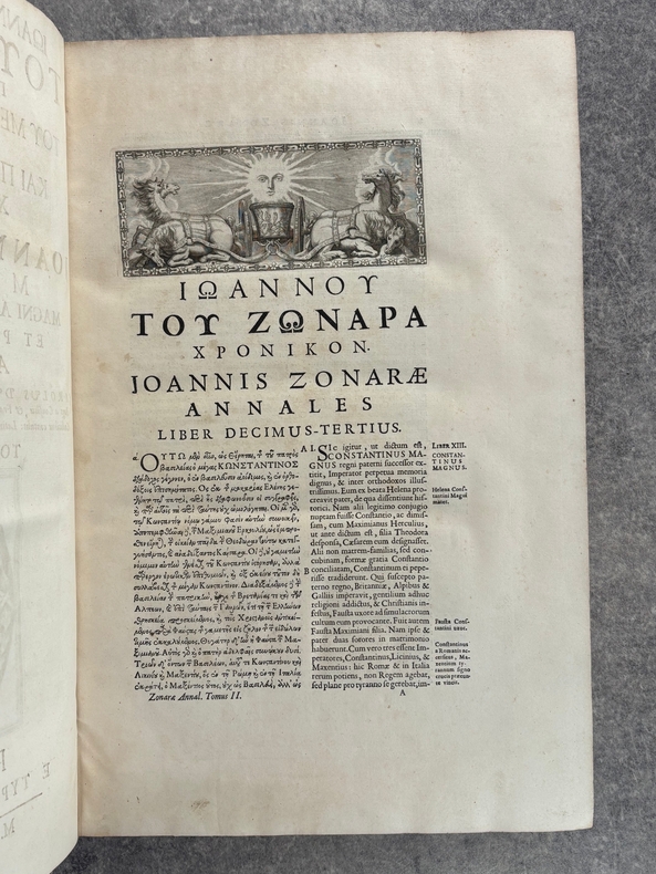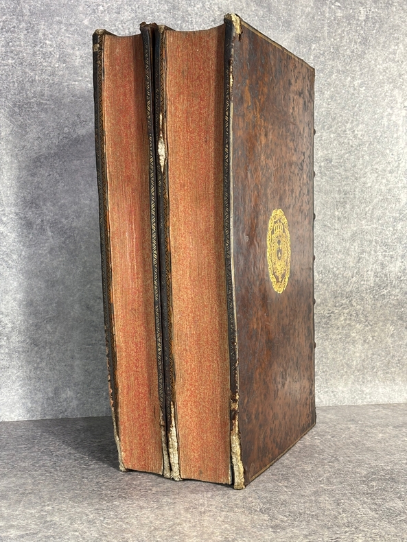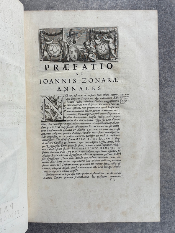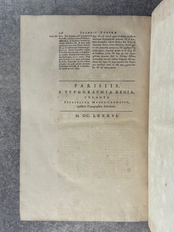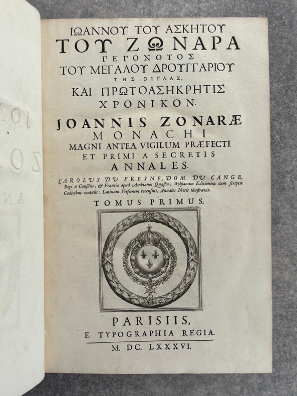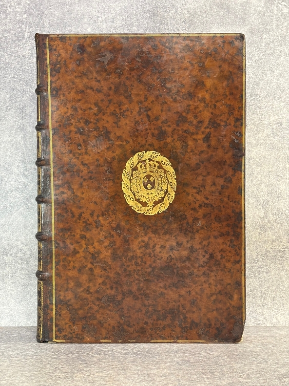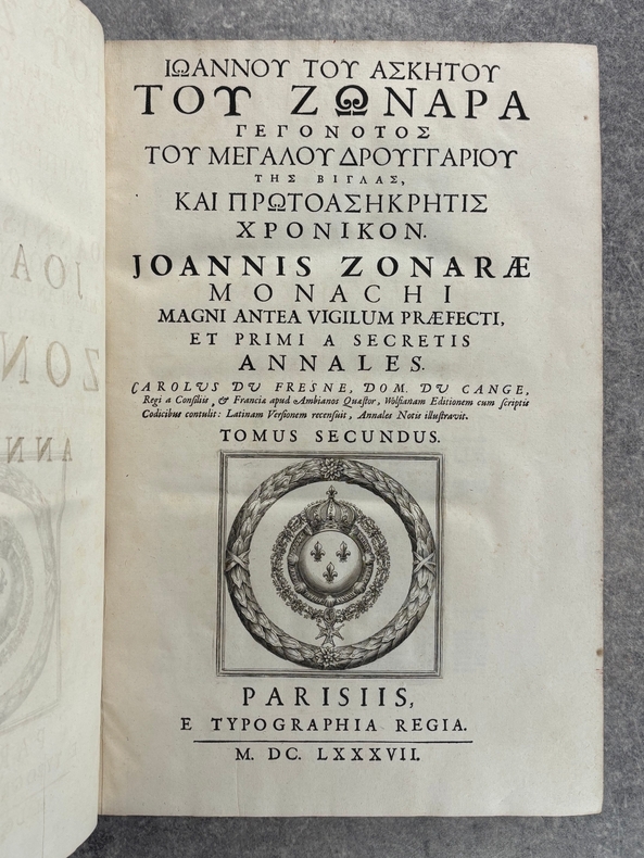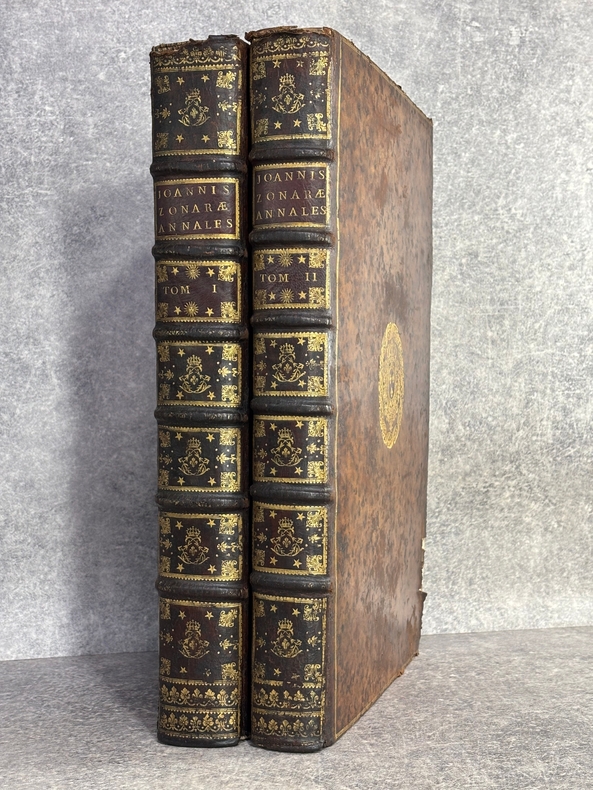 PARISIIS. E TYPOGRAPHIA REGIA. 1686-1687. 2 GRANDS VOLUMES IN-FOLIO (31 X 44,5 X 12,5 CENTIMETRES ENVIRON) DE (32) + 648 ET (4) + 362 + 163 + (68) PAGES, RELIURE D'EPOQUE PLEIN VEAU MARBRE, DOS A SIX NERFS ORNE DE CAISSONS A FLEURONS DORES AUX EMBLEMES ROYAUX, TITRE DORE SUR ETIQUETTE MAROQUIN ROUGE, TRIPLE FILET DORE ENCADRANT LES PLATS AVEC ARMES ROYALES DOREES DE LOUIS XIV AU CENTRE, DENTELLE DOREE SUR COUPES, TRANCHES MOUCHETEES ROUGES. TEXTE GREC ET LATIN EN REGARD SUR DEUX COLONNES. DEBUT DU TITRE EN CARACTERES GRECS. COLOPHON: PARISIIS, E TYPOGRAPHIA REGIA, CURANTE SEBASTIANO MABRE-CRAMOISY, EJUSDEM TYPOGRAPHIAE DIRECTORE, 1686-1687. ILLUSTRE D’UNE GRANDE VIGNETTE DE TITRE AUX ARMES DE LOUIS XIV, REPETEE DANS CHACUN DES VOLUMES, DE BANDEAUX ET LETTRES ORNEES. DE LA COLLECTION BYZANTINE PUBLIEE SOUS LA DIRECTION DU PERE LABBE A QUI CETTE CHARGE AVAIT ETE CONFIEE PAR COLBERT. OUVRAGE RARE. QUELQUES DEFAUTS DE RELIURE, DONT MANQUES DE CUIR, SINON BON ETAT INTERIEUR.