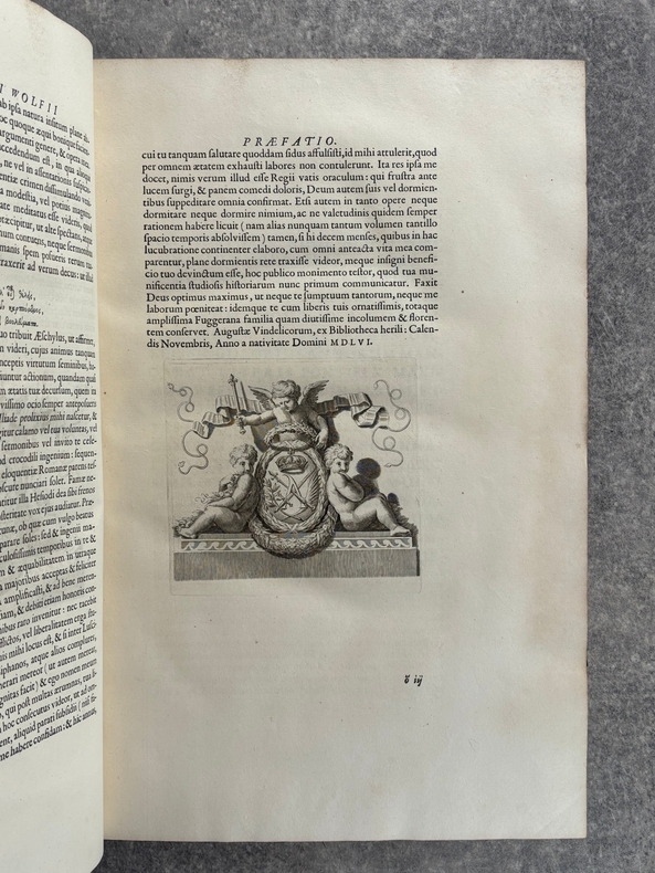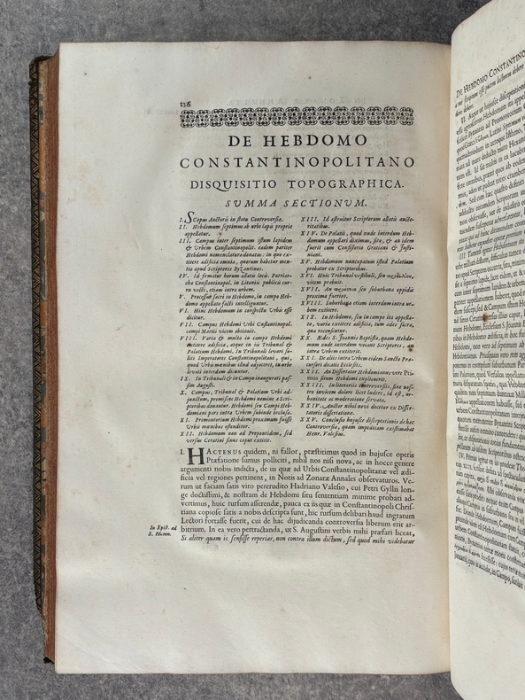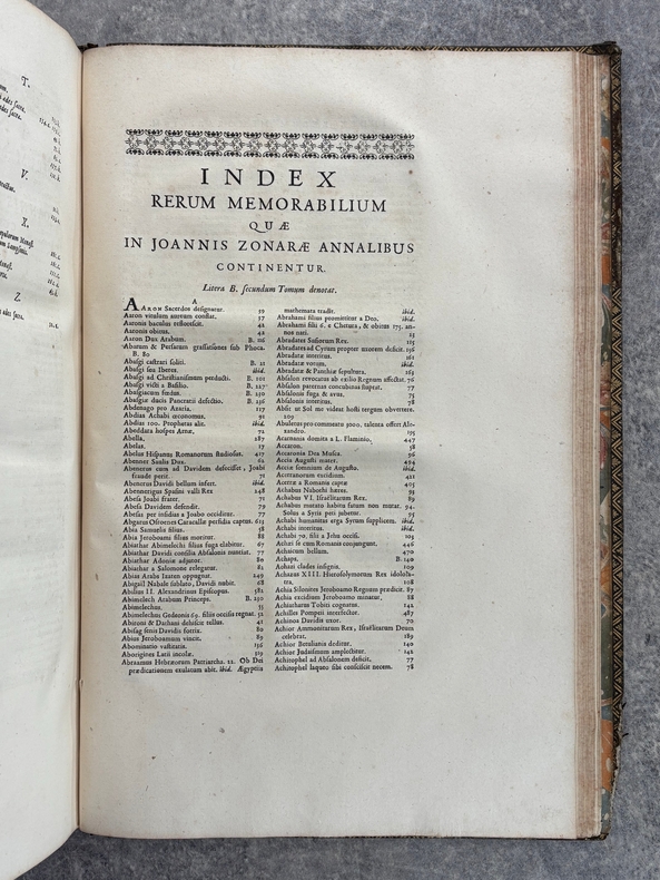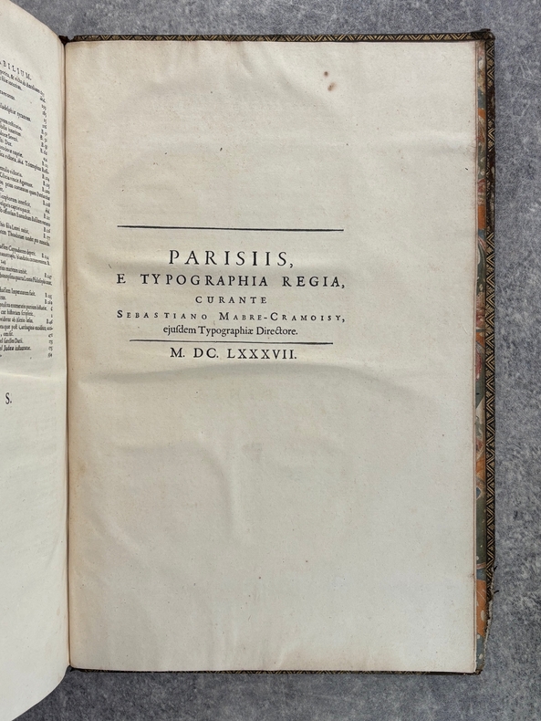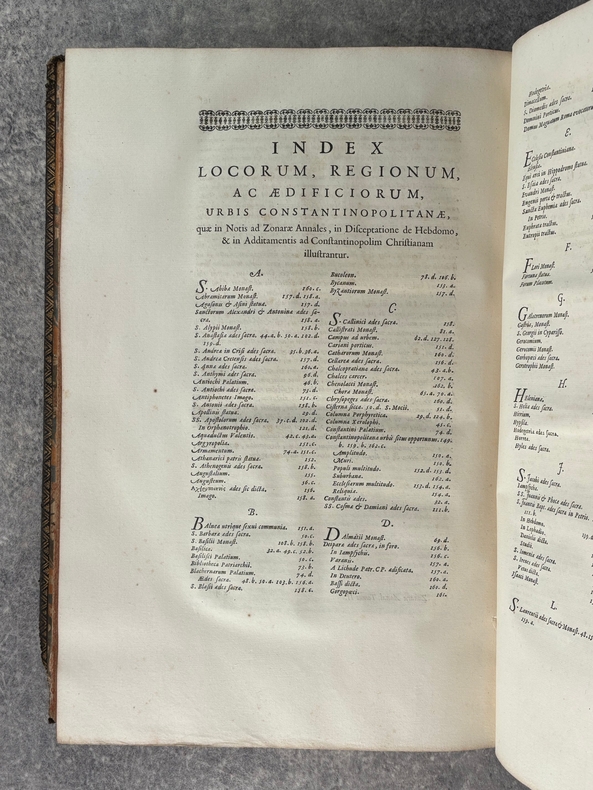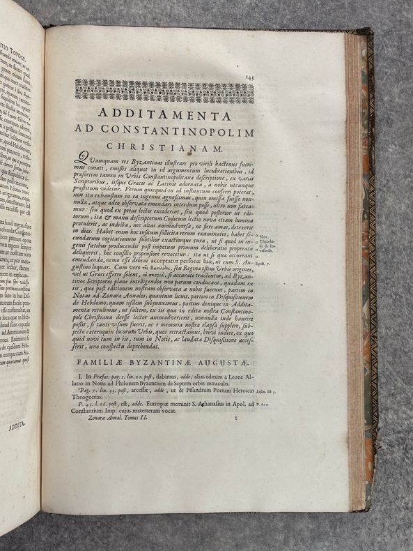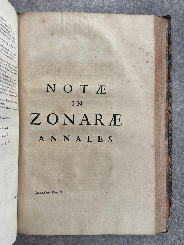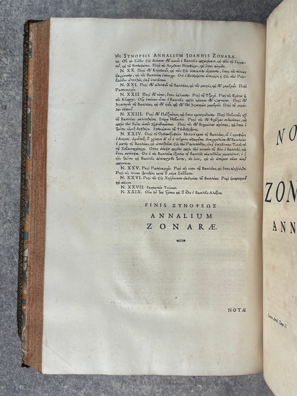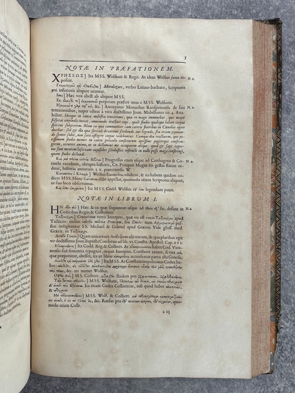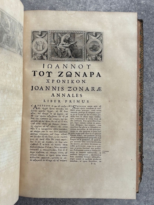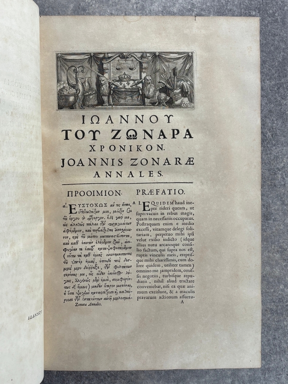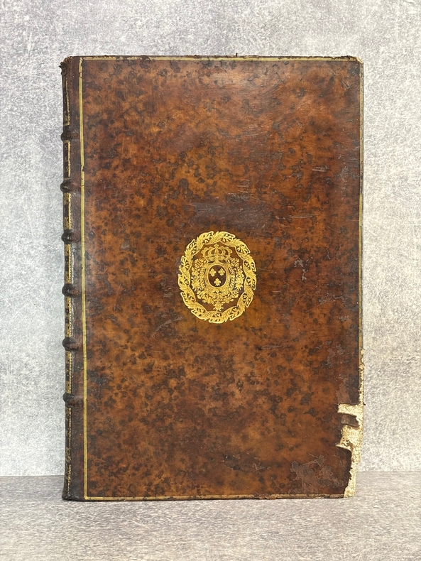 PARISIIS. E TYPOGRAPHIA REGIA. 1686-1687. 2 GRANDS VOLUMES IN-FOLIO (31 X 44,5 X 12,5 CENTIMETRES ENVIRON) DE (32) + 648 ET (4) + 362 + 163 + (68) PAGES, RELIURE D'EPOQUE PLEIN VEAU MARBRE, DOS A SIX NERFS ORNE DE CAISSONS A FLEURONS DORES AUX EMBLEMES ROYAUX, TITRE DORE SUR ETIQUETTE MAROQUIN ROUGE, TRIPLE FILET DORE ENCADRANT LES PLATS AVEC ARMES ROYALES DOREES DE LOUIS XIV AU CENTRE, DENTELLE DOREE SUR COUPES, TRANCHES MOUCHETEES ROUGES. TEXTE GREC ET LATIN EN REGARD SUR DEUX COLONNES. DEBUT DU TITRE EN CARACTERES GRECS. COLOPHON: PARISIIS, E TYPOGRAPHIA REGIA, CURANTE SEBASTIANO MABRE-CRAMOISY, EJUSDEM TYPOGRAPHIAE DIRECTORE, 1686-1687. ILLUSTRE D’UNE GRANDE VIGNETTE DE TITRE AUX ARMES DE LOUIS XIV, REPETEE DANS CHACUN DES VOLUMES, DE BANDEAUX ET LETTRES ORNEES. DE LA COLLECTION BYZANTINE PUBLIEE SOUS LA DIRECTION DU PERE LABBE A QUI CETTE CHARGE AVAIT ETE CONFIEE PAR COLBERT. OUVRAGE RARE. QUELQUES DEFAUTS DE RELIURE, DONT MANQUES DE CUIR, SINON BON ETAT INTERIEUR.
