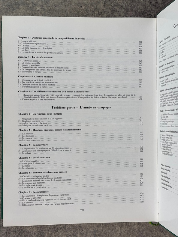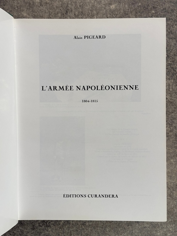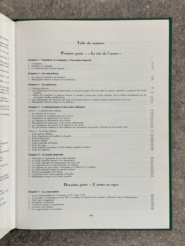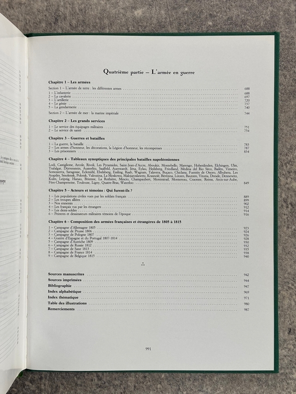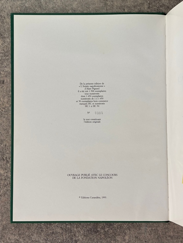 PARIS. EDITIONS CURANDERA. 1993. FORT VOLUME GRAND IN-4 (25 X 32,5 X 6 CENTIMETRES ENVIRON) DE 991 + (1) PAGES, RELIURE DE L'EDITEUR A LA BRADEL PLEINE PERCALINE VERTE, TITRE DORE SUR DOS LISSE ET SUR LE PLAT SUPERIEUR, SOUS JAQUETTE ILLUSTREE EN COULEURS. IMPORTANTE ICONOGRAPHIE EN NOIR ET EN COULEURS DE CETTE IMPORTANTE ETUDE SUR LA GRANDE ARMEE. COMPLETE PAR UN INDEX ALPHABETIQUE, UN INDEX THEMATIQUE ET UNE BIBLIOGRAPHIE. EDITION ORIGINALE. TIRAGE LIMITE A 1500 EXEMPLAIRES NUMEROTES, DONT 50 HORS COMMERCE, CELUI-CI PORTANT LE NUMERO 365. OUVRAGE EPUISE, RARE. EX-LIBRIS ANDRE BROCHARD A SAINTES. BEL EXEMPLAIRE.