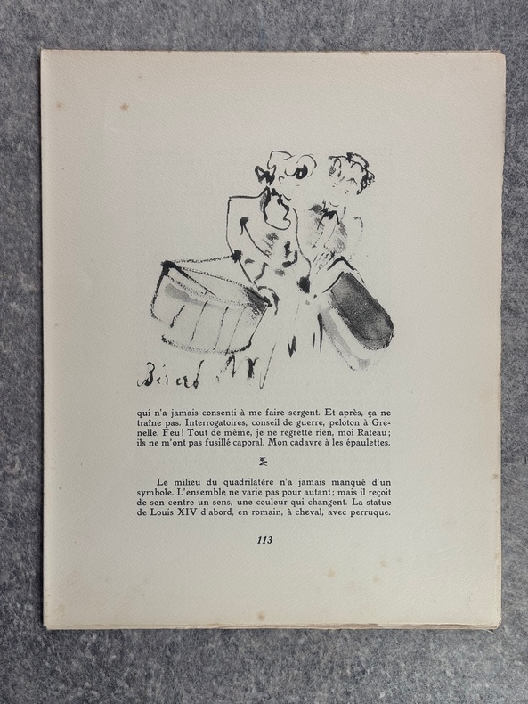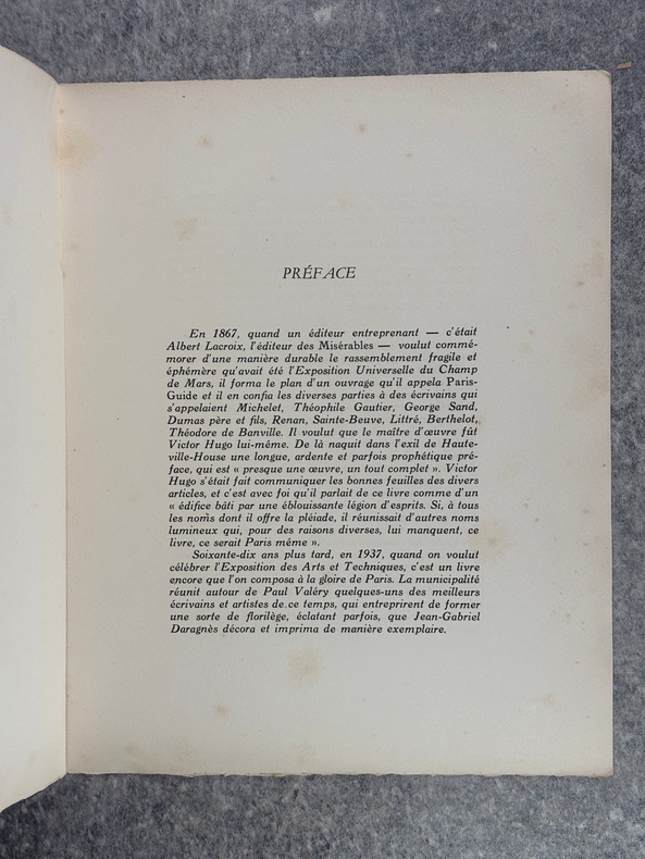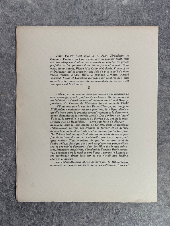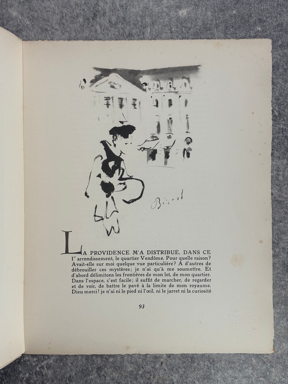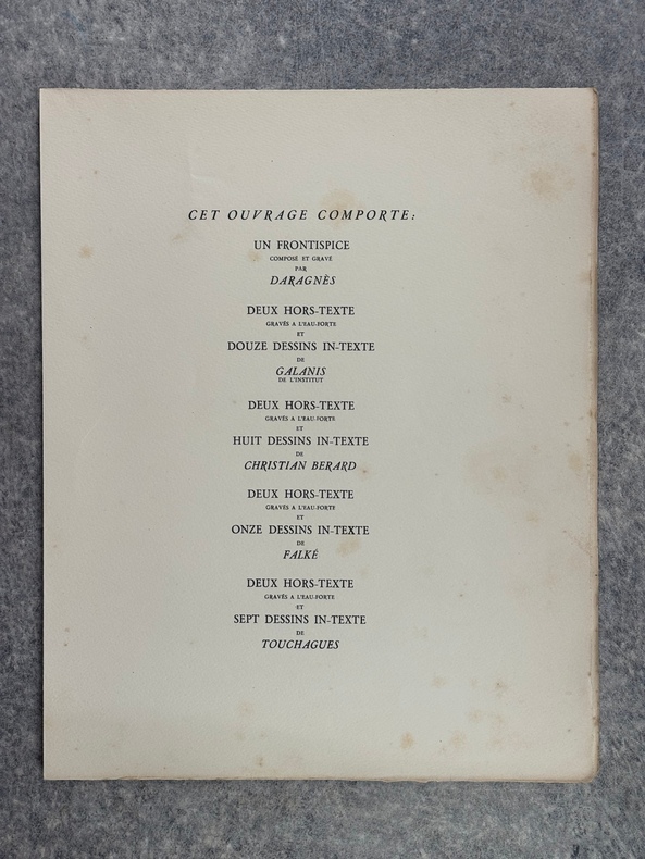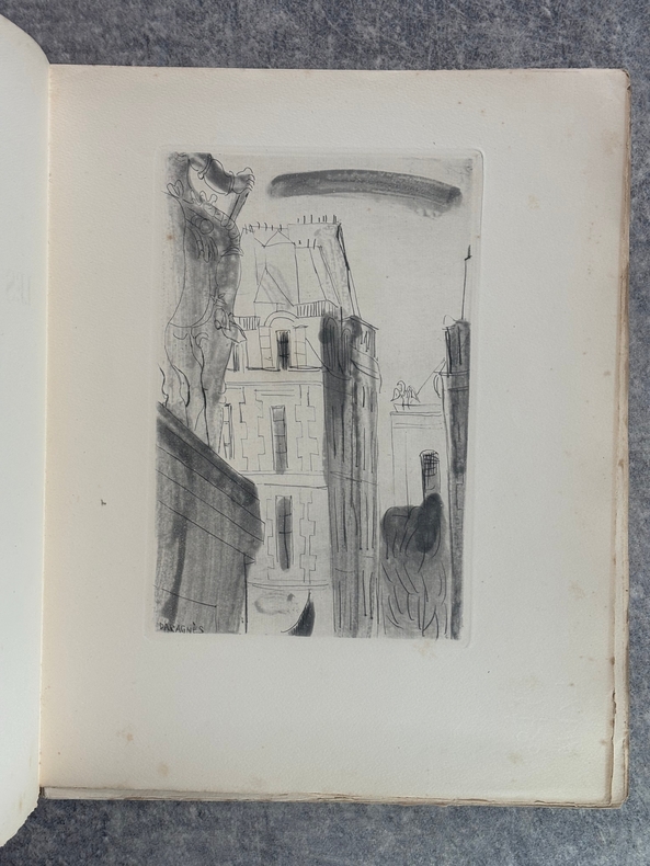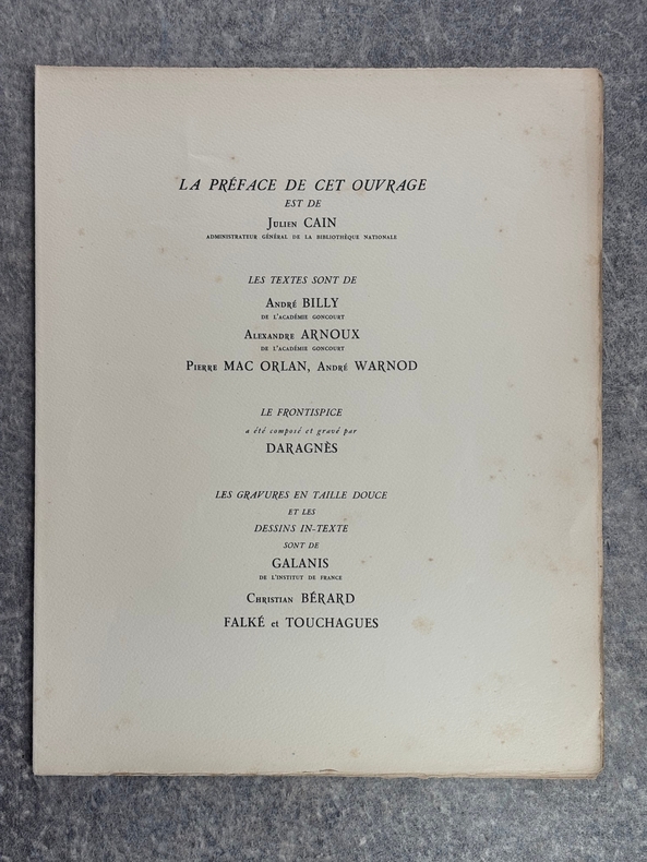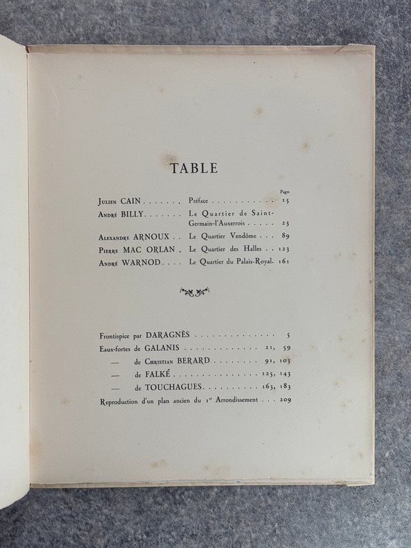 PETIT IN-4 EN FEUILLES (23 X 29 CENTIMETRES ENVIRON) DE 213 PAGES, COUVERTURE CREME REMPLIEE, TITRE IMPRIME EN NOIR. PREFACE DE JULIEN CAIN, TEXTES DE ANDRE BILLY, ALEXANDRE ARNOUX, PIERRE MAC ORLAN ET ANDRE WARNOD. ILLUSTRE D’UN FRONTISPICE PAR DARAGNES, DE 2 HORS-TEXTE ET 12 DESSINS DANS LE TEXTE DE GALANIS, DE 2 HORS-TEXTE ET 8 DESSINS DANS LE TEXTE DE CHRISTIAN BERARD, DE 2 HORS-TEXTE ET 11 DESSINS DANS LE TEXTE DE FALKE, DE 2 HORS-TEXTE ET 7 DESSINS DANS LE TEXTE DE TOUCHAGUES, FRONTISPICE ET HORS-TEXTE GRAVES A L’EAU-FORTE. AVEC LA REPRODUCTION HORS-TEXTE D'UN PLAN ANCIEN DU 1 ER ARRONDISSEMENT. EDITION ORIGINALE ET PREMIER TIRAGE. QUELQUES ROUSSEURS EPARSES, SINON BON EXEMPLAIRE.