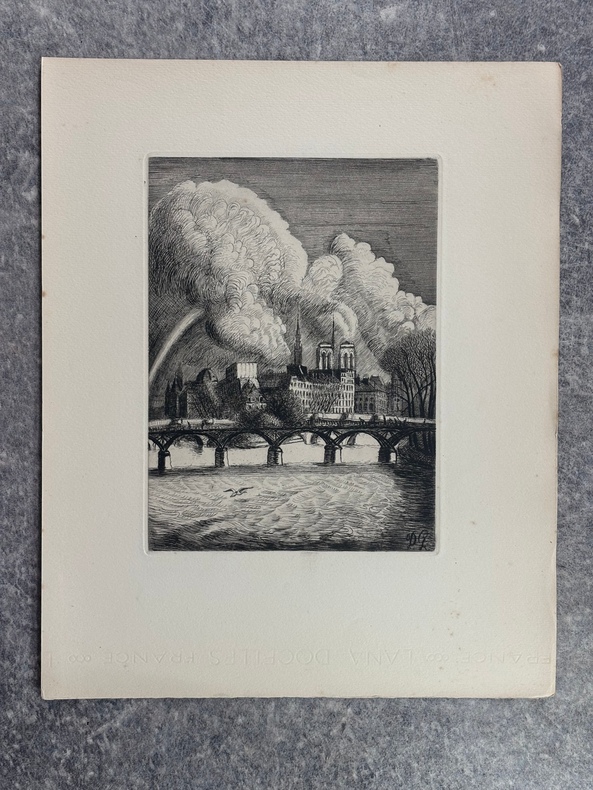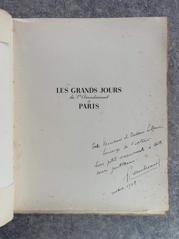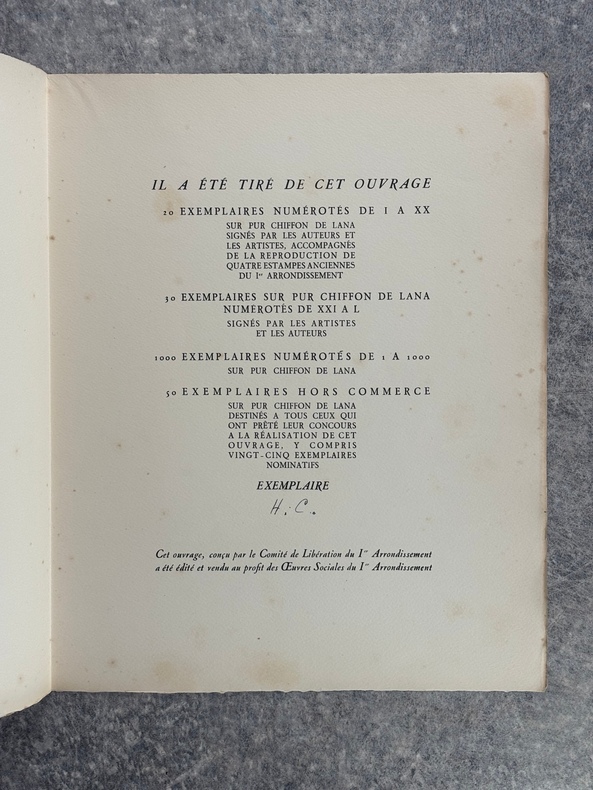 PARIS. COMITE DE LIBERATION DU 1 ER ARRONDISSEMENT. SANS DATE (1944). PETIT IN-4 EN FEUILLES (23 X 29 CENTIMETRES ENVIRON) DE 213 PAGES, COUVERTURE CREME REMPLIEE, TITRE IMPRIME EN NOIR. PREFACE DE JULIEN CAIN, TEXTES DE ANDRE BILLY, ALEXANDRE ARNOUX, PIERRE MAC ORLAN ET ANDRE WARNOD. ILLUSTRE D’UN FRONTISPICE PAR DARAGNES, DE 2 HORS-TEXTE ET 12 DESSINS DANS LE TEXTE DE GALANIS, DE 2 HORS-TEXTE ET 8 DESSINS DANS LE TEXTE DE CHRISTIAN BERARD, DE 2 HORS-TEXTE ET 11 DESSINS DANS LE TEXTE DE FALKE, DE 2 HORS-TEXTE ET 7 DESSINS DANS LE TEXTE DE TOUCHAGUES, FRONTISPICE ET HORS-TEXTE GRAVES A L’EAU-FORTE. AVEC LA REPRODUCTION HORS-TEXTE D'UN PLAN ANCIEN DU 1 ER ARRONDISSEMENT. EDITION ORIGINALE ET PREMIER TIRAGE. DÉDICACE SUR LA PAGE DE FAUX-TITRE : « POUR MONSIEUR ET MADAME LEBLANC, HOMMAGE DE L’ÉDITEUR. BIEN PETIT REMERCIEMENT À TOUTES LEURS GENTILLESSES. MASSEBIAU. » (PAUL MASSEBIAU, APPELÉ « LE COLONEL MASSEBIAU », MAIRE DU 1ER ARRONDISSEMENT DE PARIS, 1944-1945). QUELQUES ROUSSEURS EPARSES, PLANCHES HORS TEXTE FRAICHES. BON EXEMPLAIRE.