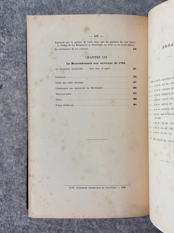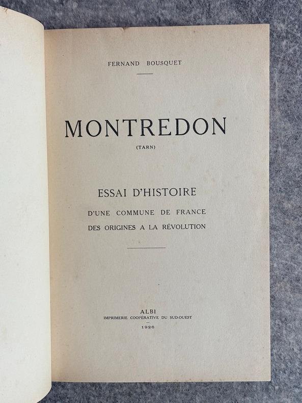 ALBI. IMPRIMERIE COOPERATIVE DU SUD-OUEST. 1926. IN-8 (17 X 25 X 4,5 CENTIMETRES ENVIRON) DE 408 + (1) PAGES, RELIURE D’EPOQUE 1/2 VEAU ROUGE A BANDES, DOS LISSE ORNE DE FILETS A FROID, TITRE DORE. EDITION ORIGINALE TRES PEU COURANTE. BON EXEMPLAIRE.
