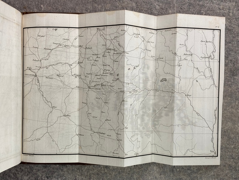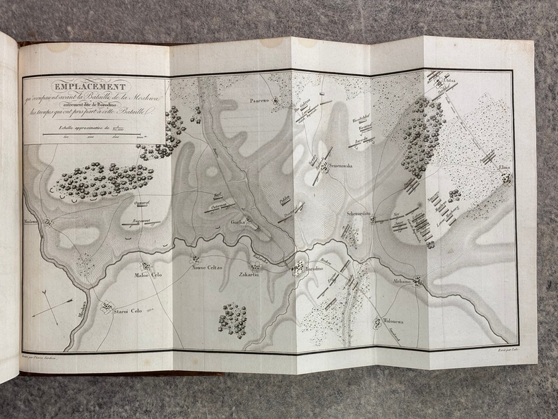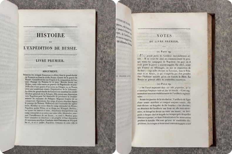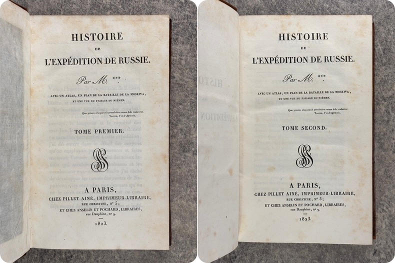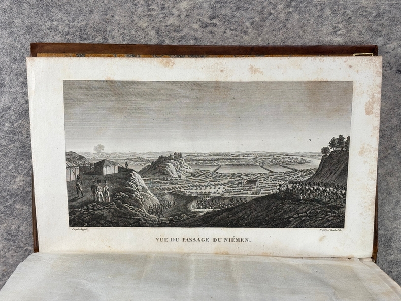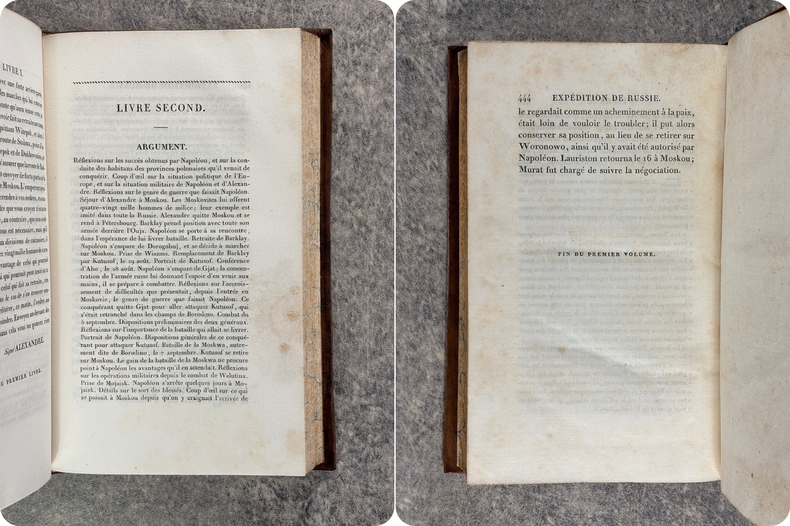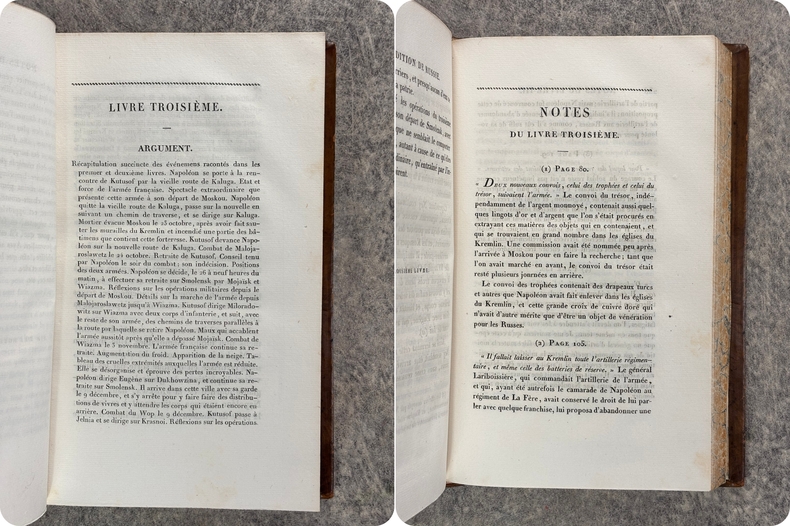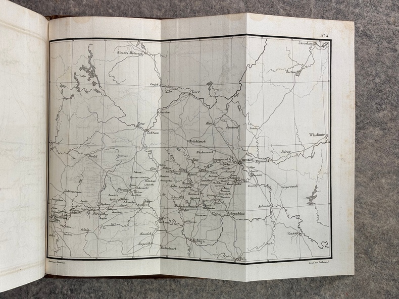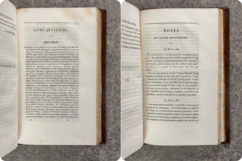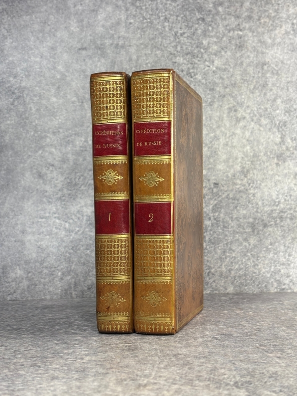 A PARIS. CHEZ PILLET AINE, IMPRIMEUR-LIBRAIRE, ET CHEZ ANSELIN ET POCHARD, LIBRAIRES. 1823. 2 VOLUMES IN-8 (13,5 X 21 X 6,5 CENTIMETRES ENVIRON) DE (4) + II + 444 ET (4) + 460 PAGES, RELIURE D’EPOQUE PLEIN VEAU RACINE, DOS LISSE ORNE DE FLEURONS DORES, GRECQUE DOREE ENCADRANT LES PLATS, FILET DORE SUR COUPES, TITRE DORE SUR ETIQUETTE MAROQUIN ROUGE, TRANCHES MARBREES. ILLUSTRE D’UN FRONTISPICE GRAVE PAR COUCHE FILS D’APRES BAGETTI (PASSAGE DU NIEMEN), SOUS SERPENTE, ET DE 4 TABLEAUX DEPLIANTS. L’ATLAS PAR BRUSSEL DE BRULART, RELIE A LA SUITE DU SECOND VOLUME SE COMPOSE DE 5 CARTES DEPLIANTES GRAVEES PAR CHAMOUÏN ET TARDIEU : UNE CARTE GENERALE DU THEATRE DE LA GUERRE FINEMENT REHAUSSEE A L’AQUARELLE, UNE CARTE DU NORD DE LA LITUANIE, CELLE DU MIDI DE CETTE MEME PROVINCE, UNE DES GOUVERNEMENTS DE MOSCOU ET DE SMOLENSK, ET UN PLAN DE LA BATAILLE DE LA MOSKOWA (EGALEMENT APPELEE BATAILLE DE BORODINO). EDITION ORIGINALE RARE. L'UNE DES MEILLEURES RELATIONS DE LA CAMPAGNE DE RUSSIE, REDIGE PAR L'UN DE SES PRINCIPAUX ACTEURS. CAPITAINE D'ARTILLERIE, AIDE DE CAMP DE MURAT, LE MARQUIS DE CHAMBRAY FUT FAIT PRISONNIER PAR LES RUSSES PENDANT LA RETRAITE DE RUSSIE EN 1812 ET MAINTENU EN CAPTIVITE EN UKRAINE OU IL RECUEILLIT LES MATERIAUX POUR LA REDACTION DE CET OUVRAGE REPUTE ET L’UN DES MIEUX DOCUMENTES SUR CETTE CELEBRE CAMPAGNE. BEL EXEMPLAIRE.