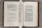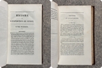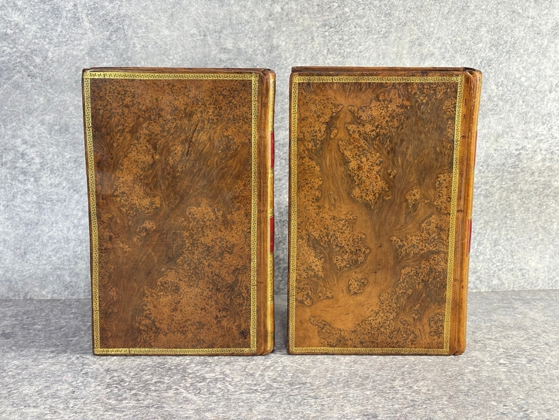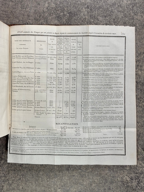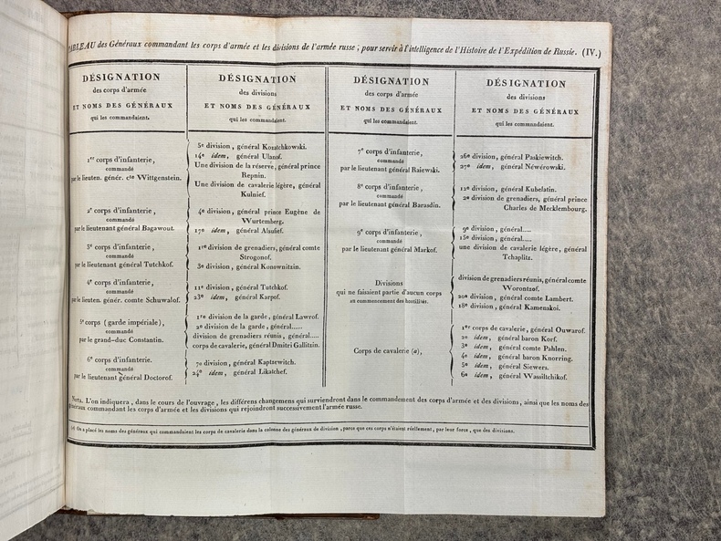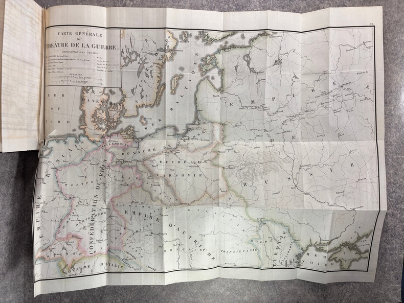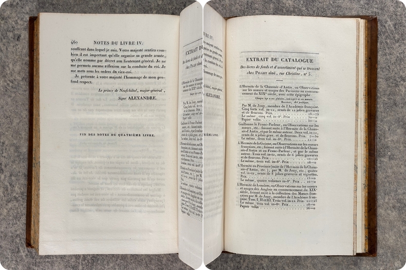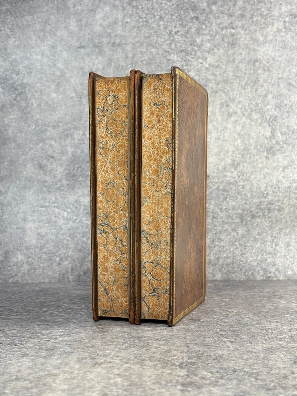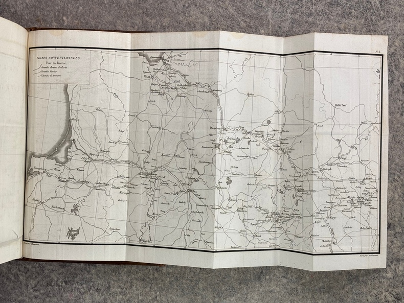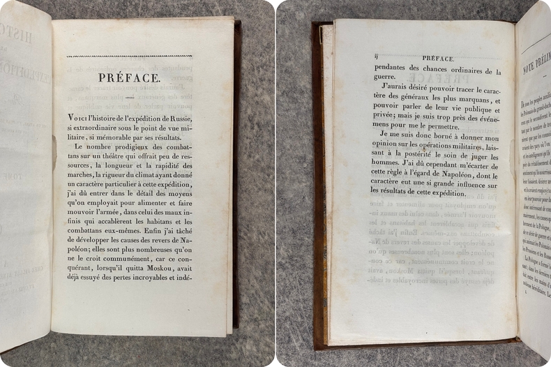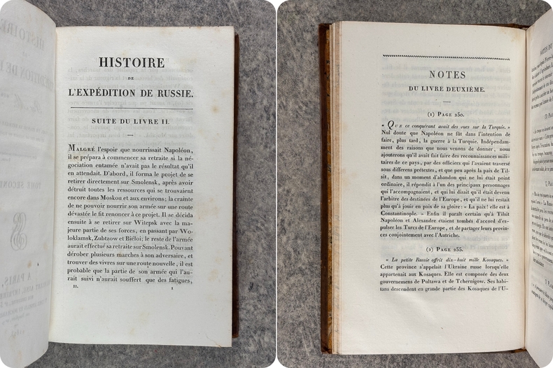 A PARIS. CHEZ PILLET AINE, IMPRIMEUR-LIBRAIRE, ET CHEZ ANSELIN ET POCHARD, LIBRAIRES. 1823. 2 VOLUMES IN-8 (13,5 X 21 X 6,5 CENTIMETRES ENVIRON) DE (4) + II + 444 ET (4) + 460 PAGES, RELIURE D’EPOQUE PLEIN VEAU RACINE, DOS LISSE ORNE DE FLEURONS DORES, GRECQUE DOREE ENCADRANT LES PLATS, FILET DORE SUR COUPES, TITRE DORE SUR ETIQUETTE MAROQUIN ROUGE, TRANCHES MARBREES. ILLUSTRE D’UN FRONTISPICE GRAVE PAR COUCHE FILS D’APRES BAGETTI (PASSAGE DU NIEMEN), SOUS SERPENTE, ET DE 4 TABLEAUX DEPLIANTS. L’ATLAS PAR BRUSSEL DE BRULART, RELIE A LA SUITE DU SECOND VOLUME SE COMPOSE DE 5 CARTES DEPLIANTES GRAVEES PAR CHAMOUÏN ET TARDIEU : UNE CARTE GENERALE DU THEATRE DE LA GUERRE FINEMENT REHAUSSEE A L’AQUARELLE, UNE CARTE DU NORD DE LA LITUANIE, CELLE DU MIDI DE CETTE MEME PROVINCE, UNE DES GOUVERNEMENTS DE MOSCOU ET DE SMOLENSK, ET UN PLAN DE LA BATAILLE DE LA MOSKOWA (EGALEMENT APPELEE BATAILLE DE BORODINO). EDITION ORIGINALE RARE. L'UNE DES MEILLEURES RELATIONS DE LA CAMPAGNE DE RUSSIE, REDIGE PAR L'UN DE SES PRINCIPAUX ACTEURS. CAPITAINE D'ARTILLERIE, AIDE DE CAMP DE MURAT, LE MARQUIS DE CHAMBRAY FUT FAIT PRISONNIER PAR LES RUSSES PENDANT LA RETRAITE DE RUSSIE EN 1812 ET MAINTENU EN CAPTIVITE EN UKRAINE OU IL RECUEILLIT LES MATERIAUX POUR LA REDACTION DE CET OUVRAGE REPUTE ET L’UN DES MIEUX DOCUMENTES SUR CETTE CELEBRE CAMPAGNE. BEL EXEMPLAIRE.
