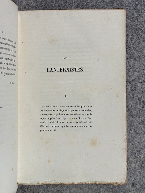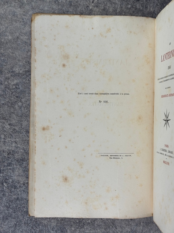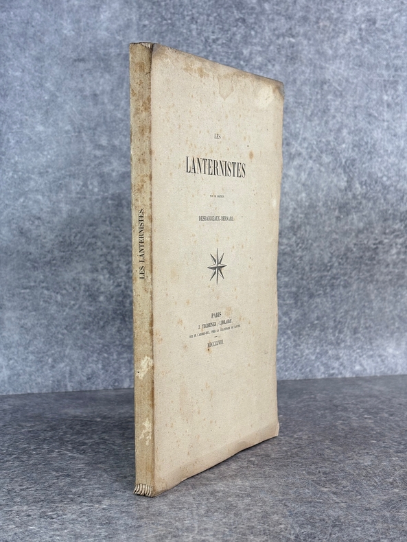 PARIS. J. TECHENER, LIBRAIRE. 1858. IN-8 BROCHE (15,5 X 24,5 X 1 CENTIMETRES ENVIRON) DE 110 PAGES, COUVERTURE CREME, TITRE IMPRIME EN NOIR. ILLUSTRE DE 4 FIGURES EN 2 PLANCHES HORS TEXTE REPRESENTANT L'AVERS ET LE REVERS DE 2 MEDAILLES DES LANTERNISTES (PAGES 54 ET 80). EDITION ORIGINALE. TIRAGE LIMITE A 132 EXEMPLAIRES NUMEROTES A LA PRESSE. (VICAIRE. III. 192). CETTE BIBLIOGRAPHIE MENTIONNE UNE EDITION PUBLIEE A 12 FRANCS AVEC 5 PORTRAITS HORS TEXTE, ET UNE AUTRE PUBLIEE A 8 FRANCS, SANS LES PORTRAITS, MAIS NE MENTIONNE PAS CES 2 PLANCHES DE MEDAILLES ?. PETITS DEFAUTS EXTERIEURS SANS AUCUNE GRAVITE, SINON BON EXEMPLAIRE.