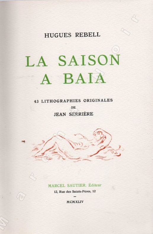 REBELL HuguesLa saison à BaiaEditions Marcel Sautier (1944), in-8 en feuilles sous chemise illustrée et étui bordeaux cartonné (légèrement défraîchi), 114 pages - Illustré de 43 lithographies originales en sanguine de Jean Serrière - Edition tirée à 260 exemplaires - Un des 25 exemplaires numérotés de 16 à 40 comportant une suite et un dessin, ici le n°20Très bel exemplaire