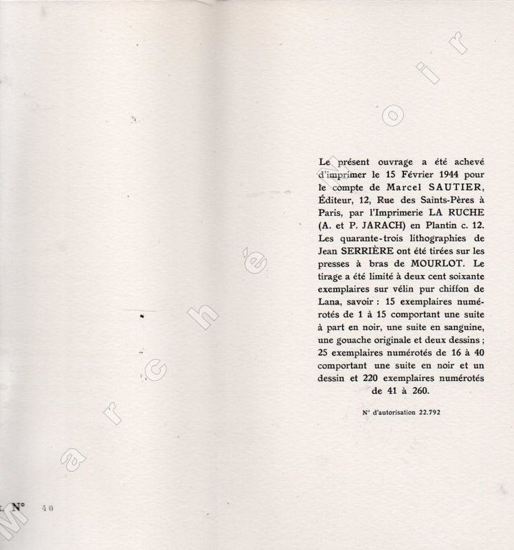 Ouvrage illustré par le peintre Jean SERRIERE (1893-1965), d'un frontispice et de 43 lithographies dans le texte ou à pleine page par Jean Serrière, tirés en sanguine par Mourlot. Tirage total à 260 exemplaires numérotés sur vélin pur chiffon de Lana, celui-ci non numéroté, est nominatif, "spécialement imprimé pour l'éditeur des édition Stendhal, Laurent Kvaraskelya".