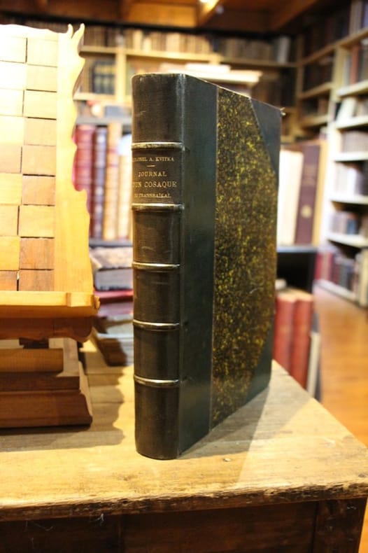 Paris, Plon-Nourrit et Cie, Imprimeurs-éditeurs 1908 In-4. Reliure demi-maroquin vert-émeraude à coins, dos à nerfs, tête dorée, premier plat de couverture illustré en couleurs conservé, 403 pp., 160 illustrations dans et hors texte d’après les photographies de l’auteur, 1 carte repliée de la campagne de Mandchourie in fine. Coins émossés et frottés, sinon bon exemplaire, intérieur très frais