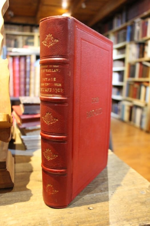 Pour le premier voyage : A Bruxelles, chez Benoit Le Francq, 1791. Pour le second voyage : A Paris, chez H.J. Hansen et Cie, l'an 3 de la République (1794-1795). 20,5 x 12,5 cm, xx-274 et 287 pages. Et XLIV-304 pp., 426 pp. et 525 pp. Cinq volumes reliés à l'identique, demi-veau, dos lisses, pièces de titre de cuir rouge. Reliures légèrement usées sinon beaux exemplaires. Description des gravures qui illustrent ces deux voyages et se décomposent comme suit : Premier voyage, 11 planches toutes colorées à la main : Campement dans le Pays des Grands Namaquois, Vue des montagnes du cap de Bonne-espérance couvertes des nuages du Sud-Est (planche dépliante), Camp de Pampoen-Kraal (planche dépliante), Le Hottentot, La Hottentote, Narina Jeune Gonaquoise, Hottentot Ganaquoi, Le Caffre, Femme Caffre, Girafe Mâle, Girafe femelle. Second voyage, 21 planches toutes colorées à la main : Campement sur l'habitation de J. Slaber à Thée Fontyn, Vue du Cap de Bonne Espérance prise en rade, Anhinga mâle, Campement au Heere Logement, Passage de la rivière des éléphants, Campement à la horde de Klaas Baster, Euphorbe-Concombre, Hippopotame, Tête de Giraffe, Camp de la Giraffe sur le bord de la rivière d'Orange, Loup tacheté, Grand Namaquois, Grande Namaquoise, Euphorbe à Côte de melon, Euphorbe à chenilles, Houzouana, Visage d'Houzouna, Femme Houzouana, Sanglier à large groin, Le singe noir, L'Oricou. SOIT EN TOUT 32 PLANCHES TOUTES COLORÉES A LA MAIN. Ouvrage incomplet de 6 planches.