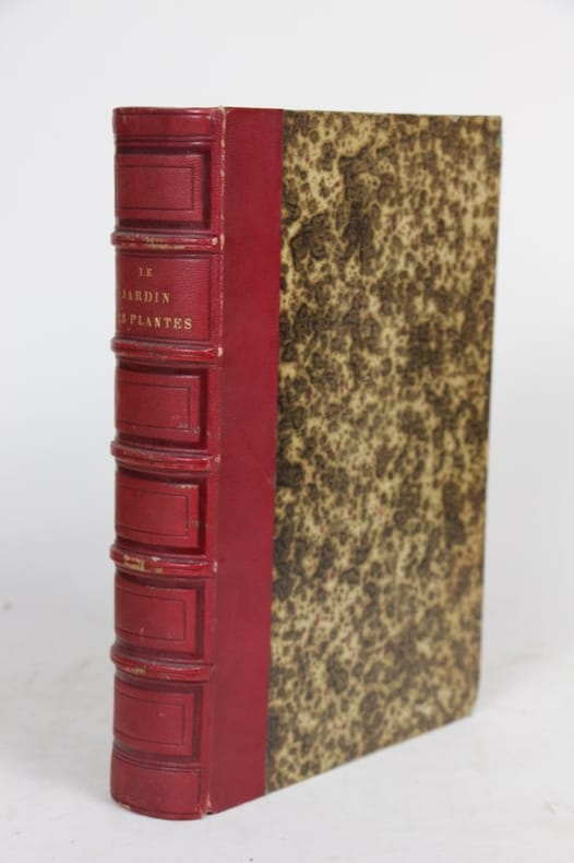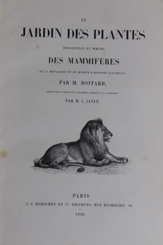 Paris, J.-J. Dubochet et Cie 1845 In-4 27 x 18 cm. Reliure éditeur demi-chagrin vert, dos à nerfs ornés defilets et encadrés de fers dorés, LXVI-472 pp.,110 gravures à l'eau-forte dans le texte, 53 planches hors-texte, dont vues du Jardin des plantes, portraits de Buffon et de Cuvier, plan dépliant du jardin en premier tirage et 4 planches d’oiseaux coloriées d’après Traviès, table alphabétique des noms de genre. Reliure légèrement frottée, planches hors-texte brunies exceptées celles des oiseaux, intérieur frais.