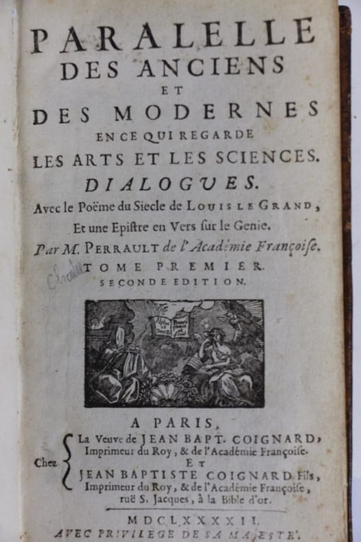 L'un des ouvrages importants dans l'histoire du XVIIe siècle Édition originale de ce célèbre ouvrage à l'origine de la Querelle des Anciens et des Modernes. C'est en raison de la polémique suscitée par sa lecture du Siècle de Louis le Grand (1687) à l'Académie Française que Charles Perrault décide de publier son Parallèle, moins pour répondre aux diverses critiques que, comme il le précise dans sa préface, pour « désabuser ceux qui ont cru que mon Poëme n'estoit qu'un jeu d'esprit, qu'il ne contenoit point mes véritables sentimens ». De fait, il maintient dans son uvre en prose que si « les Anciens sont excellents, comme on ne peut pas en disconvenir, les Modernes ne leur cedent en rien, & les surpassent mesme en bien des choses ». Cette première partie du Parallèle 3 autres seront publiées en 1690 (l'éloquence), 1692 (la poésie) et 1696 (diverses matières : l'astronomie, la géographie, la philosophie, etc.) est assez logiquement consacré aux arts et aux sciences. En effet pour servir la cause des Modernes il est plus judicieux de commencer par évoquer les incontestables progrès techniques et scientifiques dus à l'accumulation du savoir humain au fil des siècles. En même temps le traitement de faveur accordé à l'architecture, considérée comme le premier des beaux-arts, s'explique par l'intérêt ancien de Charles pour l'art de bâtir, à qui, s'il faut le croire, il doit sa carrière. Le tome inaugural met en scène trois personnages (le président, l'abbé et le chevalier) qui décident de se rendre à Versailles en l'absence du roi. Après un premier dialogue sur la prévention en faveur des Anciens (pp. 1-107), Perrault en vient au parallèle proprement dit sur les beaux-arts (pp. 109-252). Celui qui avait été chargé de surveiller les bâtiments royaux et en avait conclu les marchés d'adjudication ne peut que faire la part belle à l'architecture (pp. 110-176) et à Versailles, magnifique condensé « de beautés toutes nouvelles ». Passeront ensuite en revue la sculpture (pp. 176-198) puis pour finir la peinture. Malgré la trêve de 1694 officialisée par l'embrassade de Boileau et de Perrault, chefs des deux partis, la querelle s'internationalise à la fin du XVIIe siècle et la « Querelle d'Homère » va alors enflammer aussi bien Paris que Londres et Naples. Charles Perrault (1628- 1703), homme de lettres, célèbre pour ses Contes de ma mère l'Oye, contrôleur général des Bâtiments du roi, chancelier de l'Académie française, fut le chef de file des Modernes dans la Querelle qui les opposa aux Anciens. Exemplaire bien complet du feuillet d'errata qui manque souvent ; habile restauration à la coiffe inférieure, biffures au titre.