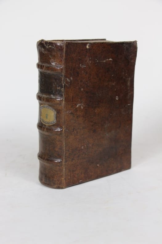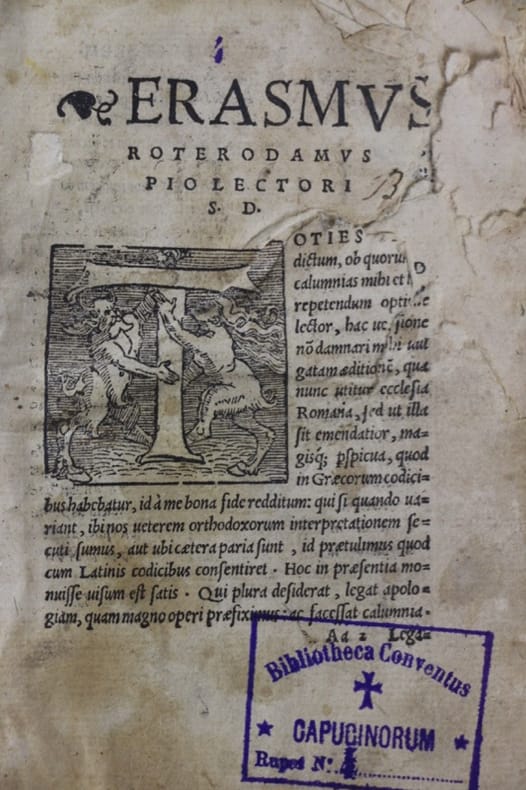Argentorati [Strasbourg] apud Johannem Hervagium 1523 In-12, plein veau, dos à nerfs rel. XVIII, blanc déchiré, sans titre, 5 premiers ff. avec accrocs angulaires et atteintes du texte, 20 pp. pour le Paraclesis, avec léger accroc marginal, sans atteinte, 14 pp. de table sous colonnades gravées, 152 ff. ch.- 135 ff. ch.- 2 ff. Accrocs en marge sans atteinte. Lettrines gravées. Reliure post. un peu gauchie, coiffe usée en tête, titre à froid : “Novum testamentum secundum”. Etiquette de classement. Tampons bibliothèque capucine.