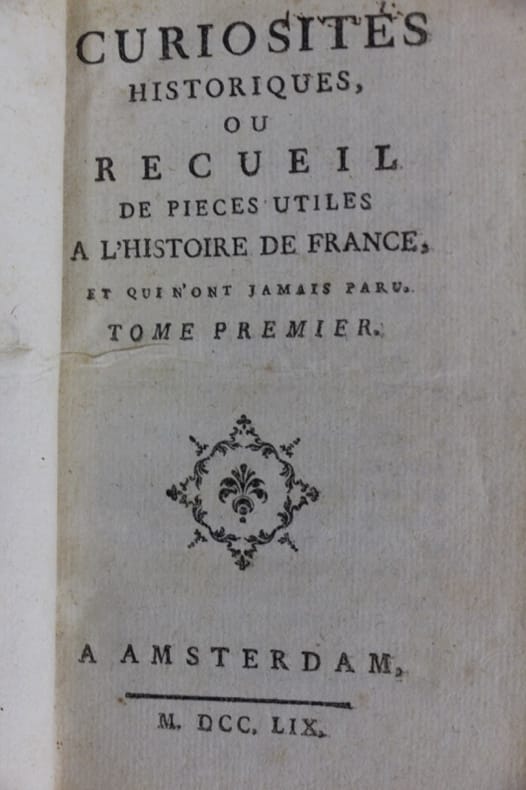 Assortiment de documents touchant à divers épisodes intéressants dans l'histoire de France, y compris des mémoires, essais et biographies. Notamment : la relation circonstanciée, du duel des ducs de Beaufort et de Nemours, mémoires et anecdotes pour servir à l’histoire de Pologne, funérailles de la Reine etc. Le second volume s'ouvre avec le "procès criminel, fait au cadavre de Frère Jacques Clément, jacobin," un compte rendu du procès posthume du moine qui a assassiné Henri III de France. Il contient également un texte curieux sur "la pucelle d'Orléans". Bon état d’occasion