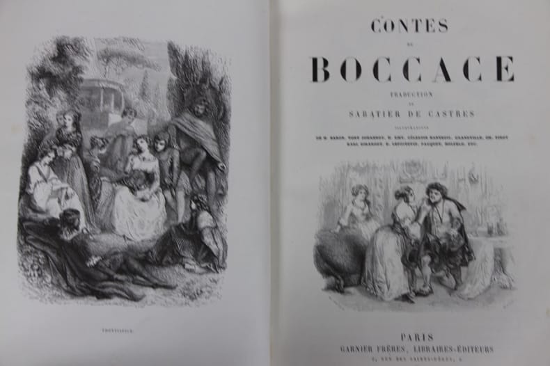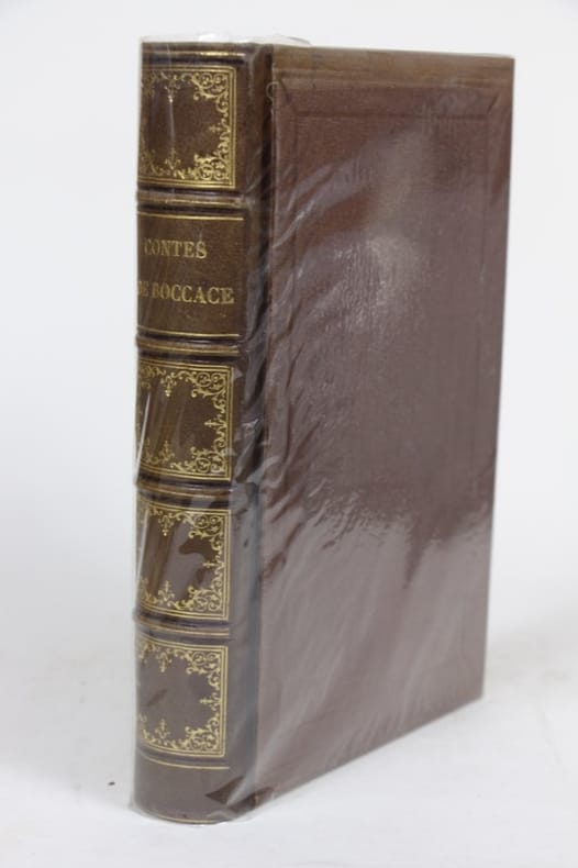 Contes de Boccace, traduction de Sabatier de Castres, illustrations de H. Baron, TYony Johannot, H. Emy,Celestin Nanteuil, Grandville, CH. Pinot, Karl Girardet, E. Lepoitevin, Pauquet, Holfeld, etc, 32 gravures hors texte et nombreuses illustrations dans le texte, reliure en cuir rouge, dos orné, les tranches dorés, 562 pp, 27 x 18 cm
