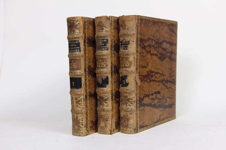 Edition originale ; complète des trois volumes la constituant. L'ensemble recèle une grande carte dépliante ainsi qu'une planche ; gravées. ''Pierre-Joseph d'Orléans est l'un de nos historiens les plus estimés''. (in Quérard). ''L'auteur a pris soin ici de rapprocher sous un même point de vue l'histoire de différents petits états qui se formèrent sur les débris de l'empire mahométan et de rappeler sans cesse son lecture sur l'importance et sur la variété des événements''. De Bure II, Bibliographie instructive ou Traité de la connaissance des livres rares et singuliers, 5524 - Brunet II, Manuel du libraire et de l'amateur de livres, 822 - Quérard VI, La France littéraire, p. 502. Trois coiffes légèrement élimées. Infimes altérations superficielles affectant les reliures. Petit défaut (sans conséquence) affectant les charnières du dernier tome. Rousseurs éparses dans les corps d'ouvrage. Quelques plissures marginales affectant la carte. Du reste, bonne condition.