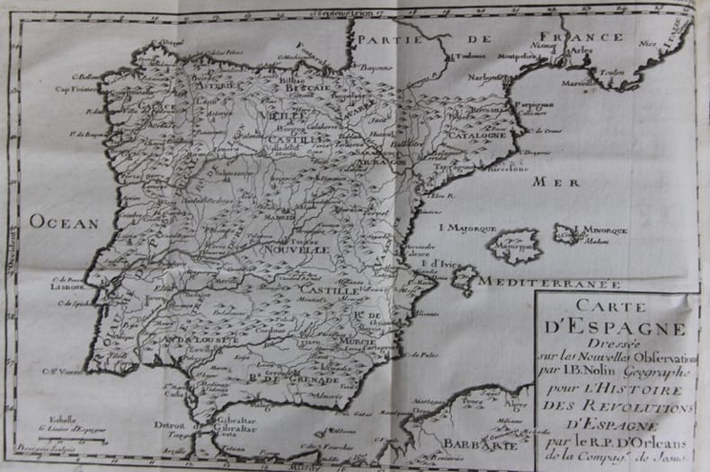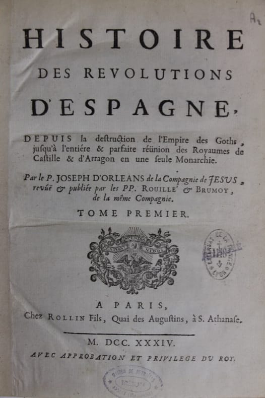 Paris, Rouille & Brumoy, Chez Rollin Fils 1734 3 volumes in-4, plein veau marbré, dos à nerfs, pièces de titre et tomaison de maroquin noir, caissons ornés, fers spéciaux, écusson de classement en pied, dentelle d’encadrement des plats, tranches dorées, XXXVI- 579- [37]- XIV- [2]-644 -[26]- VII- [1]- 655- [24] pp. Une grande carte dépliante de l'Espagne par Jean-Baptiste Nolin et un tableau généalogique dépliant. Dos usés, mors fendillés, accrocs aux titres et tomaisons. Bel état intérieur.