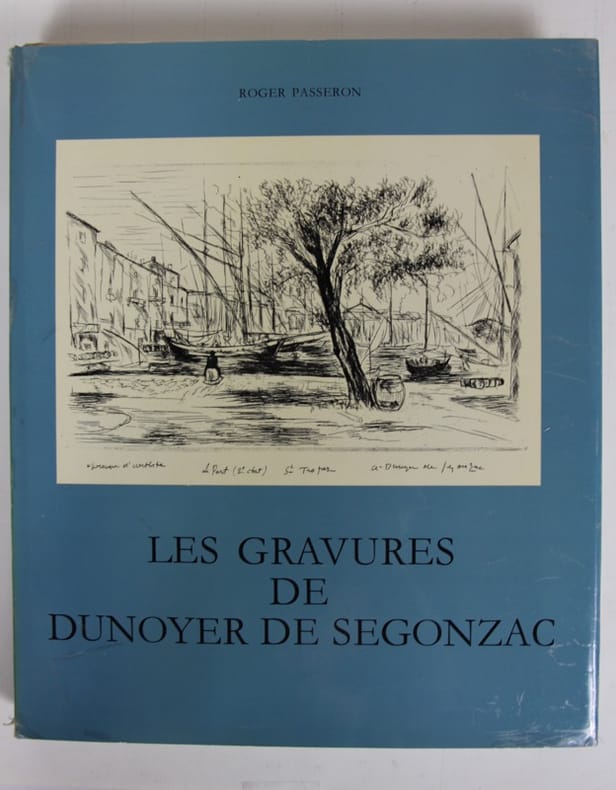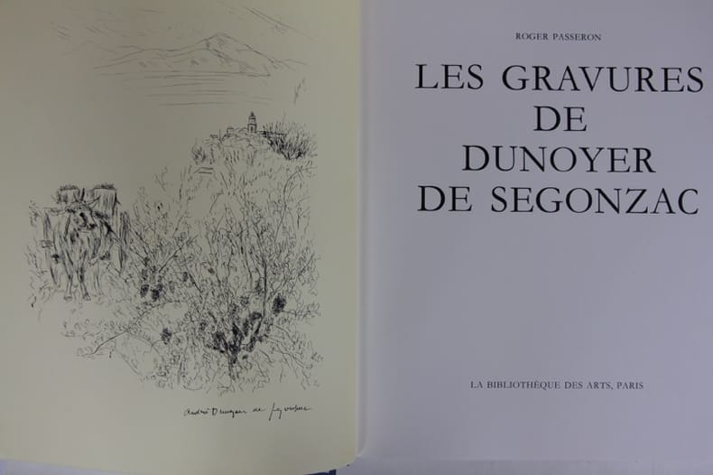 Paris, La Bibliothèque des Arts 1970 In-folio 34 x 28 cm. Reliure éditeur pleine toile bleu-roi sous jaquette illustrée et glacée, 167 pp., imprimé sur papier vélin blanc de luxe, 56 gravures reproduites en fac-similé, catalogue des gravures, principales dates de la vie artistique de Dunoyer de Ségonzac, table des matières. Tirage limité à 650 exemplaires sur vélin, numérotés de 1 à 650. Celui-ci, N 244 enrichi d’une dédicace de l’artiste à la princesse d’Arenberg.