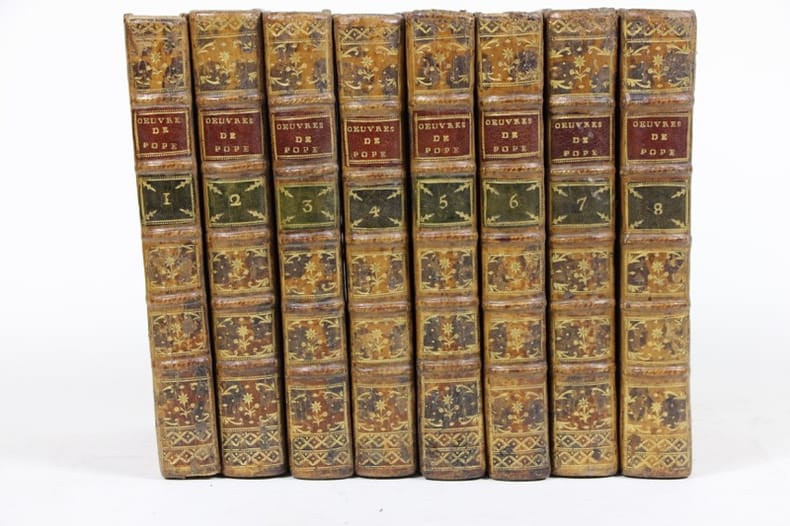 DURAND 1780 A paris, Chez Durand, 1780, 8 tomes reliés en 4 volumes in-12 de 115 x 175 mm environ, CIV pages (Histoire de la vie d'A. Pope, Préface), 290 pages, (1) f.; VJ pages, 471 pages; 466 pages; 468 pages; 456 pages; 479 pages; 472 pages; 523 pages. Complet du frontispice et des 17 gravures d'après C. P. Marillier. Reliures postérieures demi-chagrin cerise, dos à 4 nerfs portant titres et tomaisons dorés, gardes marbrées. Exemplaires de bibliothèque : étiquettes papier collées sur les plats supérieurs, tampons sur les pages de titres, sinon coins légèrement frottés, de très rares rousseurs, bon état général.