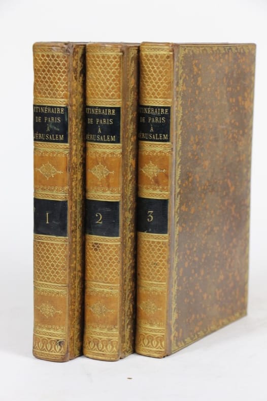 PARIS. LEFEVRE, LIBRAIRE-EDITEUR. LADVOCAT, EDITEUR. 1829-1830. 3 VOLUMES IN-8 (15 X 22,5 X 18 CENTIMETRES ENVIRON) RELIURE D'EPOQUE 1/2 VEAU ROUGE A COINS SOULIGNEE D’UN FILET DORE, DOS LISSE ORNE D'UN ELEGANT DECOR ROMANTIQUE A FROID ET DORE, TITRE DORE SUR ETIQUETTE MAROQUIN VERT, TRANCHES MARBREES. COMPREND :- ATALA. RENE. LES AVENTURES DU DERNIER ABENCERAGE. 1830. (4) + XXIV ET 376 PAGES. ILLUSTRE DE 4 GRAVURES SUR ACIER, DONT UNE EN FRONTISPICE, GRAVEES PAR BURDET D’APRES ALAUX.- ITINERAIRE DE PARIS A JERUSALEM, ET DE JERUSALEM A PARIS. 1829. 2 VOLUMES DE (4) + CLX + 350 ET (4) + 411 PAGES. ILLUSTRE D’UNE CARTE DE L’ITINERAIRE REPLIEE. «DE CETTE RANDONNEE MEDITERRANEENNE QUI NE FUT NI SANS CHARMES NI SANS PERILS, L'ITINERAIRE OFFRE UNE RELATION OU LES NOTATIONS PITTORESQUES LE DISPUTENT AUX REFLEXIONS HISTORIQUES ET AUX MEDITATIONS PHILOSOPHIQUES. DERRIERE LES TABLEAUX SOMPTUEUX DE L'ACROPOLE RAYONNANTE, DE LA TRISTESSE DE JERUSALEM ET D'ALEXANDRIE, DES DEBRIS DE SPARTE OU DE CARTHAGE, S'IMPOSE ENCORE UNE FOIS LE SENTIMENT D'UNE SENSIBILITE EXCEPTIONNELLE AUX GRANDS MOUVEMENTS DE L'HISTOIRE». (D. RINCE).QUELQUES PETITS DEFAUTS EXTERIEURS, SINON BEL EXEMPLAIRE DANS UNE JOILE RELIURE STRICTEMENT CONTEMPORAINE.