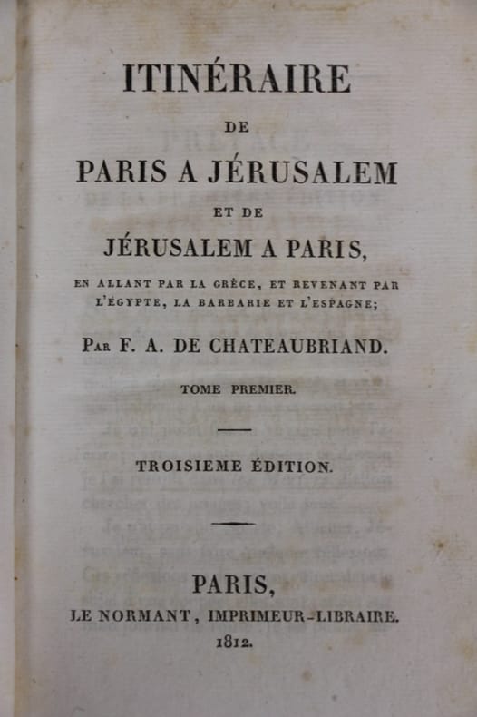 L'itinéraire de voyage de Chateaubriand de Paris à Jérusalem est bien documenté dans son célèbre récit de voyage intitulé "Itinéraire de Paris à Jérusalem" (publié en 1811). parcours résumé de son voyage aller-retour : Paris à Jérusalem (aller) : Paris, France : Chateaubriand a commencé son voyage à Paris. Suisse : Il a traversé la Suisse, s'arrêtant notamment à Genève. Italie : Il est ensuite entré en Italie, passant par Milan et Venise. Grèce : Chateaubriand a visité Athènes, où il a exploré les ruines antiques, notamment l'Acropole. Turquie (Constantinople) : Il est arrivé à Constantinople (l'actuelle Istanbul en Turquie), où il a séjourné un certain temps et a exploré la ville. Terre sainte (Jérusalem) : Son voyage l'a finalement conduit à Jérusalem, où il a visité les lieux saints du christianisme, y compris le Saint-Sépulcre. Jérusalem à Paris (retour) : Le retour de Chateaubriand de Jérusalem à Paris a suivi à peu près le même itinéraire, bien qu'il ait pu faire quelques détours et visites supplémentaires en chemin. Il est retourné en Europe par la voie terrestre, repassant par Constantinople, la Grèce, l'Italie, la Suisse, et enfin la France. Son "Itinéraire de Paris à Jérusalem" est un récit de voyage littéraire célèbre qui décrit non seulement les aspects géographiques de son voyage, mais aussi ses réflexions personnelles sur la religion, la politique et la culture. C'est un texte important de la littérature de voyage du 19e siècle. Complet, deux tomes en un volume relié demi cuir, 18x12, frottements, coins émoussés, tranches jaspées, bel état intérieur, 376, 419 pages. Paris,Firmain Didot, 1852 ref/102