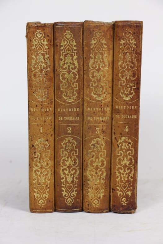 Bon exemplaire de l'édition originale, en reliure d'époque d'une facture peu commune, et en bon état (très petits mq en mors, dos très lég. frottés, des rouss.). Un important ouvrage sur l'histoire de la Touraine. "Cet ouvrage est divisé en cinq parties. La première, qui remplit les deux premiers volumes, offre le tableau des événements dont la Touraine a été le théâtre, ou qui ont eu le plus d'influence sur les destinées de cette province. Le troisième volume contient l'histoire, par ordre alphabétique, des villes, des terres et des familles les plus considérables de Touraine, la liste chronologique de ses gouverneurs et de ses principaux magistrats, et le tableau de ses établissements ecclésiastiques. Enfin, le quatrième volume est consacré à la biographe des hommes célèbres que la Touraine a produits dans tous les genres" (Michaud, Biopgraphie Universelle, LX, 378)