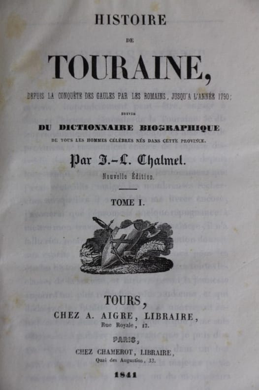 4 vol. in-8 reliure demi-basane mauve, dos estampés à froid, Chez H. Fournier Je, Paris, Chez A. Mame, et chez Moisy, Tours, 1828, 2 ff., VII-754 pp. ; 2 ff., 503 pp. ; 2 ff., 541 pp. et 1 f. ; VII-504 pp. Titre complet : Histoire de Touraine, depuis la Conquête des Gaules par les Romains, jusqu'à l'année 1790 (4 Tomes - Complet) suivie du Dictionnaire biographique de tous les hommes célèbres nés dans cette province [ Edition originale ]