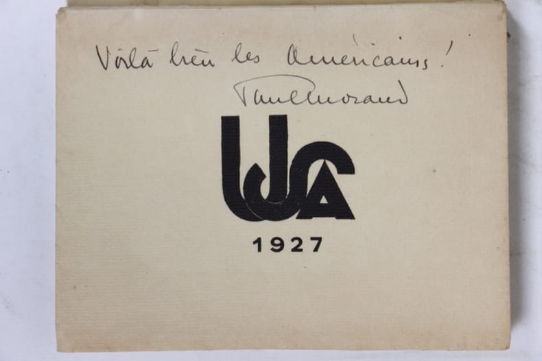 Edition originale de ce récit de voyage en vers libre, joliment composé dans le sens de la hauteur, illustré par Pierre Legrain dans le style Art Déco. Tirée à 650 exemplaires numérotés sur vélin Montgolfier Annonay. Exemplaire agrémenté d’un surtitre manuscrit de Paul Morand en couverture : “Voilà bien les américains !.” Bon état d’occasion