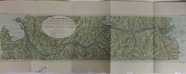Paris, Hachette 1886 Grand in-8, demi-maroquin grenat à coins, dos à nerfs, couvertures conservées tachées, 4- 399- 5 pp., portrait de l'auteur gravé sur bois en front, 90 gravures sur bois in & hors-texte, une grande carte de l'Isthme de Panama, du plan du canal les 2 sont en couleurs, attaques de ver en pied du second et un grand tableau, tous dépliants ; Rapport général : 154 pp., couverture tachée, in fine plan général en couleurs, replié en deux parties déliées avec le profil en long du canal projet à six écluses. Dos passé. Bon exemplaire