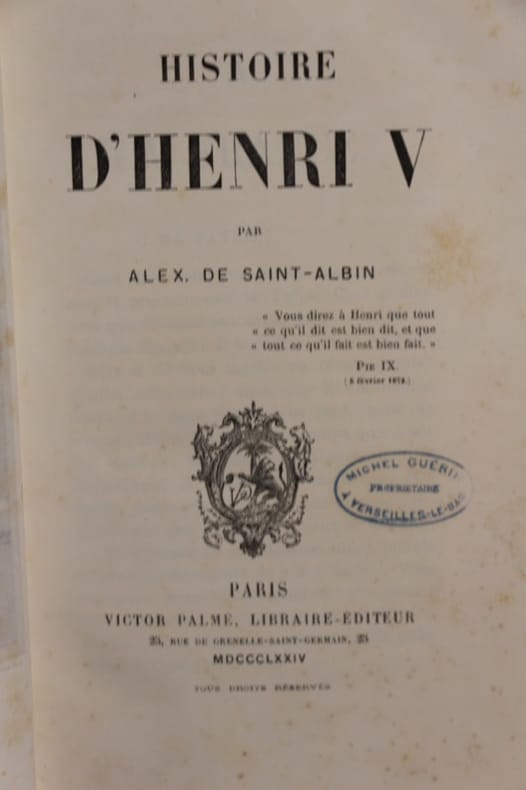Paris, Arts et métiers graphiques 1874 In-8 22,5 x 13 cm. Reliure pleine basane fauve, dos lisse orné de filets dorés, pièce de titre maroquin bleu-marine, VIII-516 pp., table des matières, joint “Manifeste du comte de Chambord” manuscrit en fac-similé [20] pp. 1874 & “Marie-Thérèse reine de France, épouse d’Henri IV”, Origine - Enfance - Vie - Portrait - Avenir par Prosper Védrenne, Paris, Tolra 1871 Ouvrage en bon état.