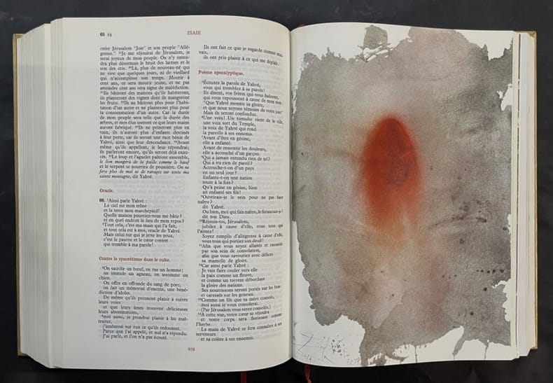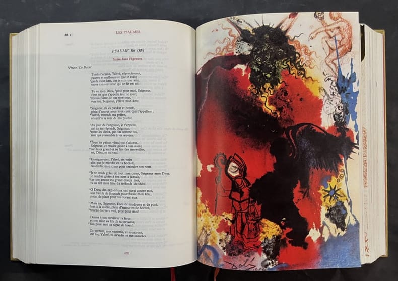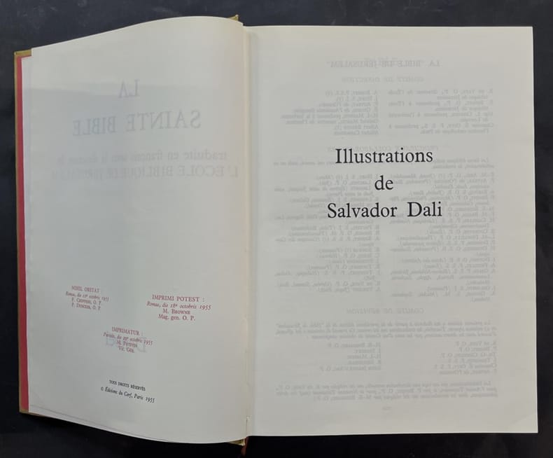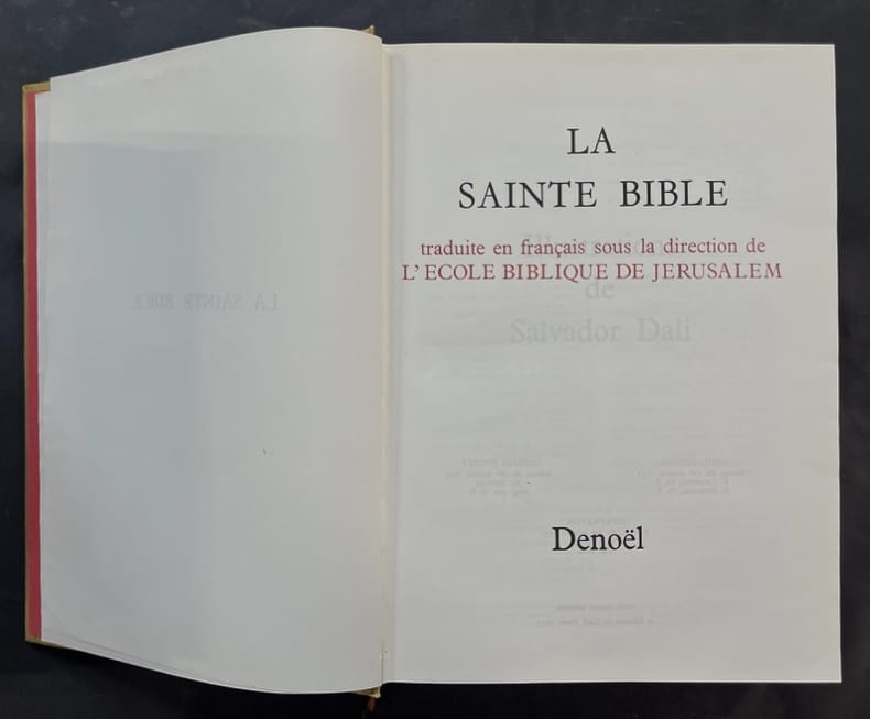 édition de 1955 imprimée en 1972. Illustrations en couleurs de Salvador Dali. Les Introductions ont été rédigées par R. de Vaux, O.P., pour l’Ancien Testament, et par P. Benoit, O. P., pour le Nouveau Testament (sauf les écrits Johanniques, dont les introductions ont été rédigés par M.-E. Boismard, O. P.) Bon état d’occasion