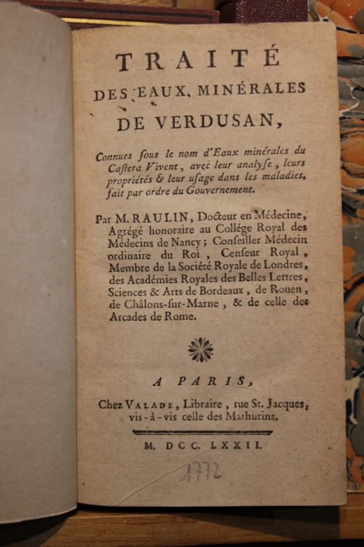 Paris, chez Valade, Libraire 1772 In-16 16,5 x 9,5 cm. Reliure postérieure XIXe s. demi-chagrin brun, dos à nerfs, 184 pp., plan replié des sources minérales de Verdusan, table des sommaires. Ex-libris de la bibliothèque du président Sacase. Reliure légèrement frottée, intérieur correct.