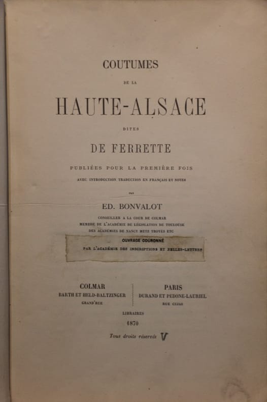 Colmar - Paris, Barth et Held-Baltzinger, Durand et Pedone-Lauriel 1870 In-8 23 x 15 cm. Reliure demi-toile verte, dos lisse, XXXIII-293 pp., notes en bas de page, table. Avec ex-libris du comte de Civry et de Charles Starck. Tampon du musée Sundgauvien, Altkirch, sur la page de garde. Reliure légèrement frottée. ouvrage peu courant.
