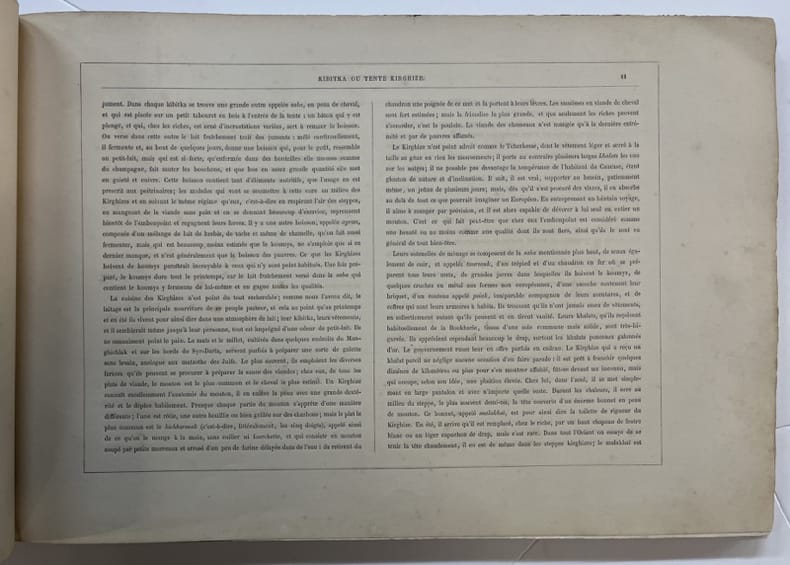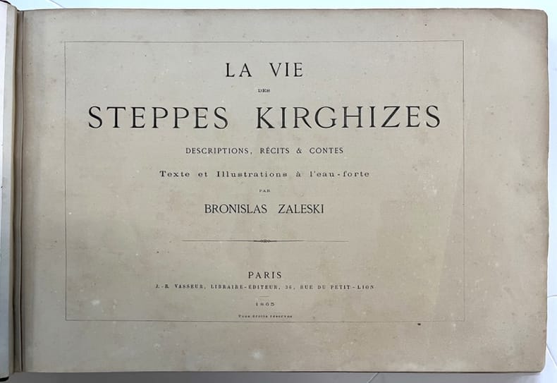 Bronislas Zaleski (1819-1880), peintre, écrivain et patriote polonais, fut déporté après le soulèvement de 1848, à Orenbourg, à la frontière de l'Asie et de l'Europe sur le fleuve Oural, où il passa un peu moins d'une décennie à parcourir une partie de la vaste steppe kazakhe. Ses dessins, magnifiquement reproduits ici sous forme de gravures, montrent des scènes au Kirghizistan et dans ce qui sont aujourd'hui des régions du Kazakhstan et de l'Ouzbékistan. Chaque planche est précédée d'un passage descriptif vivant sur le paysage, l'architecture ou les personnages représentés dans l'image. Très bon état d’occasion