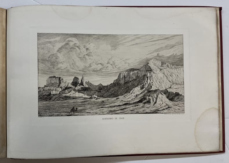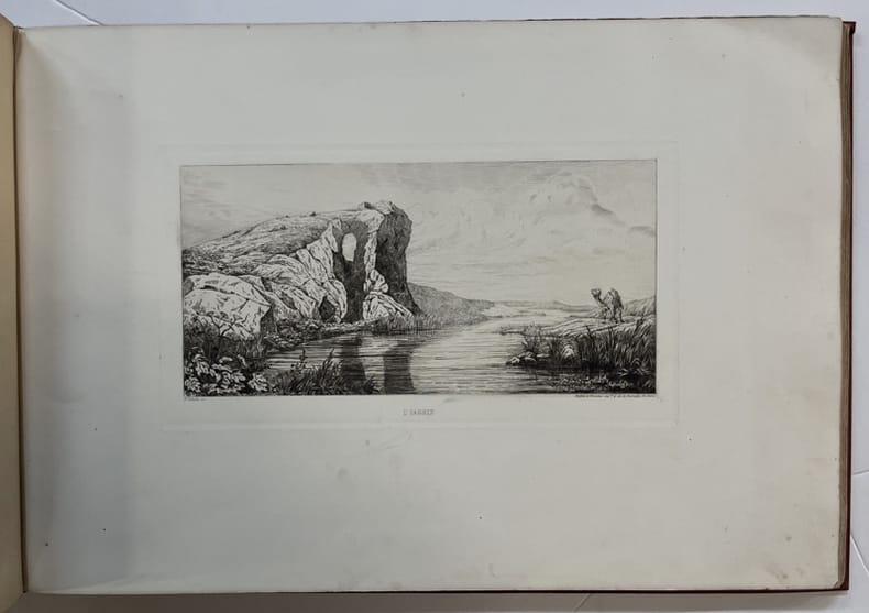 Paris, J.-B. Vasseur 1865 In-folio à l’italienne 44 x 30,5 cm. Reliure moderne demi-basane lie-de-vin, dos lisse avec titre doré, [2 ff.], 56 pp.,[6 ff.], titre-frontispe gravé, page de titre, 21 planches à pleine page hors texte dessinées par l’auteur et gravées à l’eau-forte par Beillet et Forestier. Quelques taches, faibles rousseurs, mouillures marginales sur les derniers feuillets et planches. édition originale d’un ouvrage d’une relative rareté.