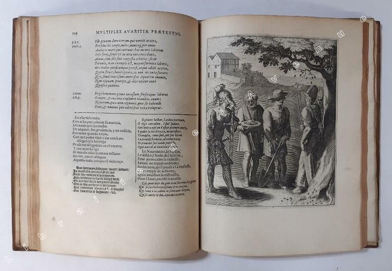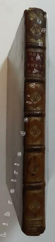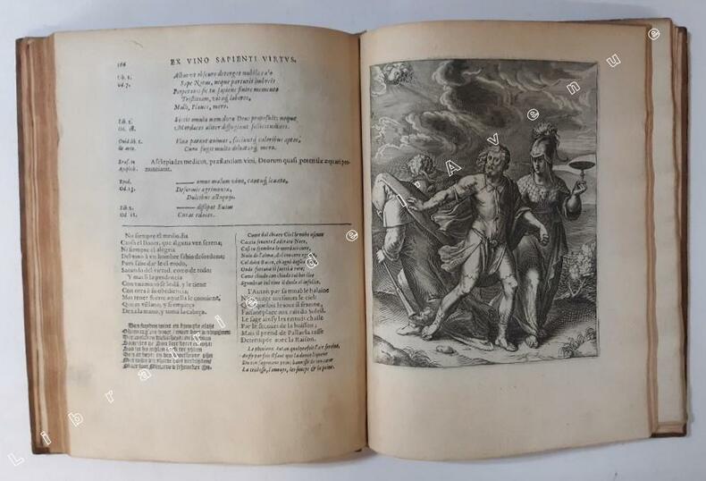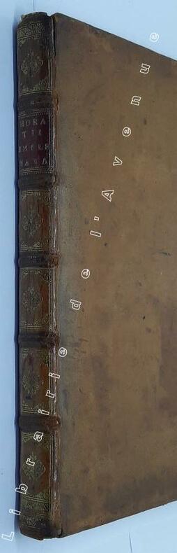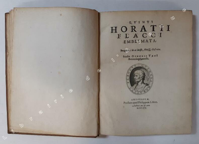 Antverpiae, ex officina Hieronymi Verdussen, Auctoris aere et cura 1607 In-4 26,5 x 20 cm. Reliure postérieure XVIIIe siècle, plein veau fauve glacé, dos à nerfs encadrés de fers dorés, pièce de titre maroquin grenat, la page de titre présente en son centre le portrait stylisé du poète latin, vu de profil, à la manière d’une médaille antique, 212 pp., 102 gravures sur cuivre d’après les poèmes d’Horace. Très bon exemplaire d’un ouvrage rare dans l’édition originale anversoise. Petits accrocs en tête et en pied de dos, coins légèrement émoussés, auréole sur chaque plat, planches très fraîches avec infimes rousseurs marginales.
