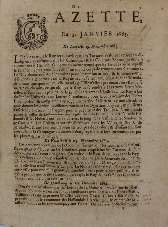 Toulouse, Jean Boude le jeune 1685 Petit in-4, plein veau granité muet, dos à nerfs, 396 pp. Accrocs des coiffes, charnières fendillées. Il manque les n 9, 21, 35, 37, 50 & 51. Le numéro 52 est chiffré 58. Avis, le 28 octobre, de la suppression de l’édit de Nantes p. 302.