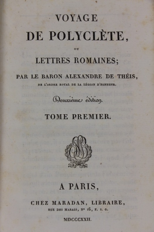 Haut fonctionnaire d'origine nantaise Alexandre Étienne Guillaume de Théis (1765-1842). Rédigé à l'imitation du "Voyage du jeune Anarcharsis en Grèce" de l'abbé Bathélémy, l'ouvrage du baron de Théis était destiné à faire connaître les us et coutumes de l'Italie antique et les institutions romaine au plus grand nombre, à travers une œuvre romanesque fondée sur l'étude des textes classiques et des travaux d'archéologie et historiographie. Le succès de l’œuvre fut tel qu'elle fut rééditée quatre fois en l'espace de deux ans, et qu'elle fut adoptée par l'Université de France parmi les livres envoyés aux bibliothèques. Troisième édition, considérablement augmentée, complet en deux volumes, Tome I : Lettre I à XXIII - Tomes II : Lettre XXIV à XLIX. Volumes gd in8, 21x14, reliés pleine basane époque, solides, frottements, qq cahiers avec rousseurs, tranches jaspées, bon état intérieur, 485, 451pp.. Paris, Grimbert, 1828 ref/240